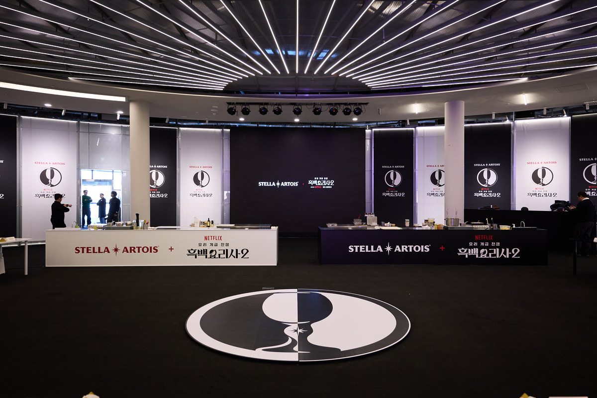 행사가 열린 곳은 한강 위 채빛섬. 공간에 들어서자마자 흑과 백의 선명한 대비가 가장 먼저 눈에 들어왔습니다. 프로그램 속 무대를 연상시키는 반원형 테이블 구조와 중앙에 위치한 오픈 키친은 방송에서 보던 장면을 자연스럽게 떠올리게 했죠. 프로그램을 시청해온 사람이라면 공간에 들어서는 순간, 익숙한 세계관에 바로 스며들 수밖에 없는 완벽한 콘셉트였습니다.