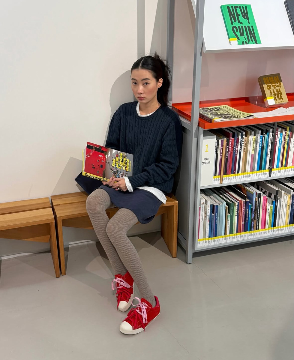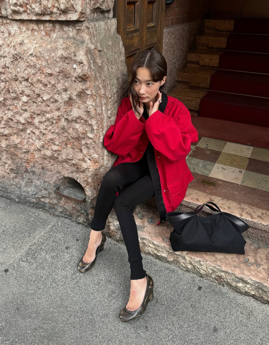 인플루언서 민주는 올블랙 코디에 매력적인 레드 컬러의 워크 재킷을 더해 강렬한 룩을 완성했어요. 더 사랑스러운 무드를 연출하고 싶다면 포인트 컬러로 활용해도 좋아요. 네이비 컬러의 니트와 스커트로 걸리시한 룩을 연출하고 레드 컬러 스니커즈를 매치한 센스! 스니커즈의 끈은 핑크&레드 리본 조합으로 선택해 스타일링을 완성했답니다. 레드 컬러의 메리제인이나 플랫 슈즈로 마무리하는 것도 추천해요.