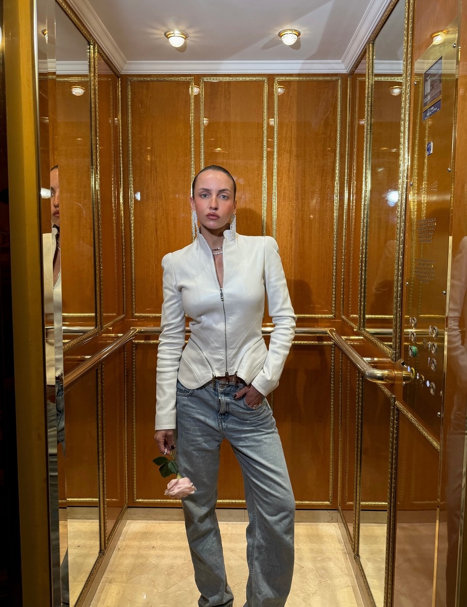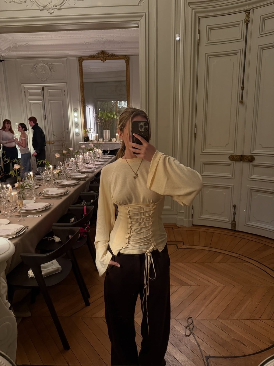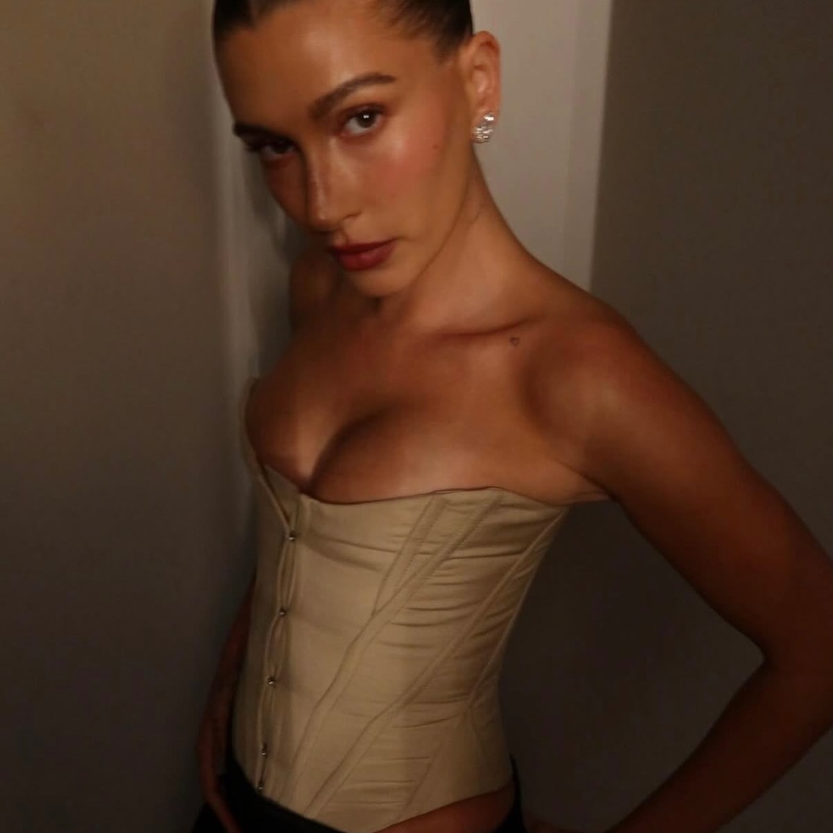 트렌드의 한가운데에 서 있는 헤일리 비버 역시 코르셋 톱을 자신만의 방식으로 소화했습니다. 베이지 코르셋 톱에 블랙 슬랙스를 매치해 미니멀하면서도 절제된 룩을 완성했죠. 액세서리는 최소화하고 볼드한 이어링 하나로 마무리한 점도 눈에 띕니다. 상체의 구조적인 실루엣이 강조되는 만큼, 하의는 담백하게 정리해야 것이 세련된 인상을 만들 수 있어요.
