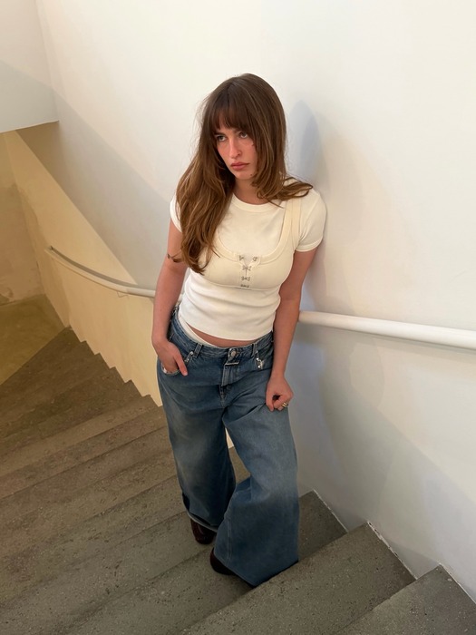 일상에서는 코르셋 톱을 어떻게 활용할 수 있을까요? 가장 먼저 레이어드로 시작해 보세요. 화이트 티셔츠 위에 코르셋 톱을 얹는 것만으로도 충분합니다. 부드러운 면 소재와 힘 있는 실루엣이 대비를 이루며 스타일링에 자연스러운 리듬이 생기거든요. 데님이나 와이드 팬츠를 매치하면 과장되지 않은 데일리 룩으로도 손색없습니다.