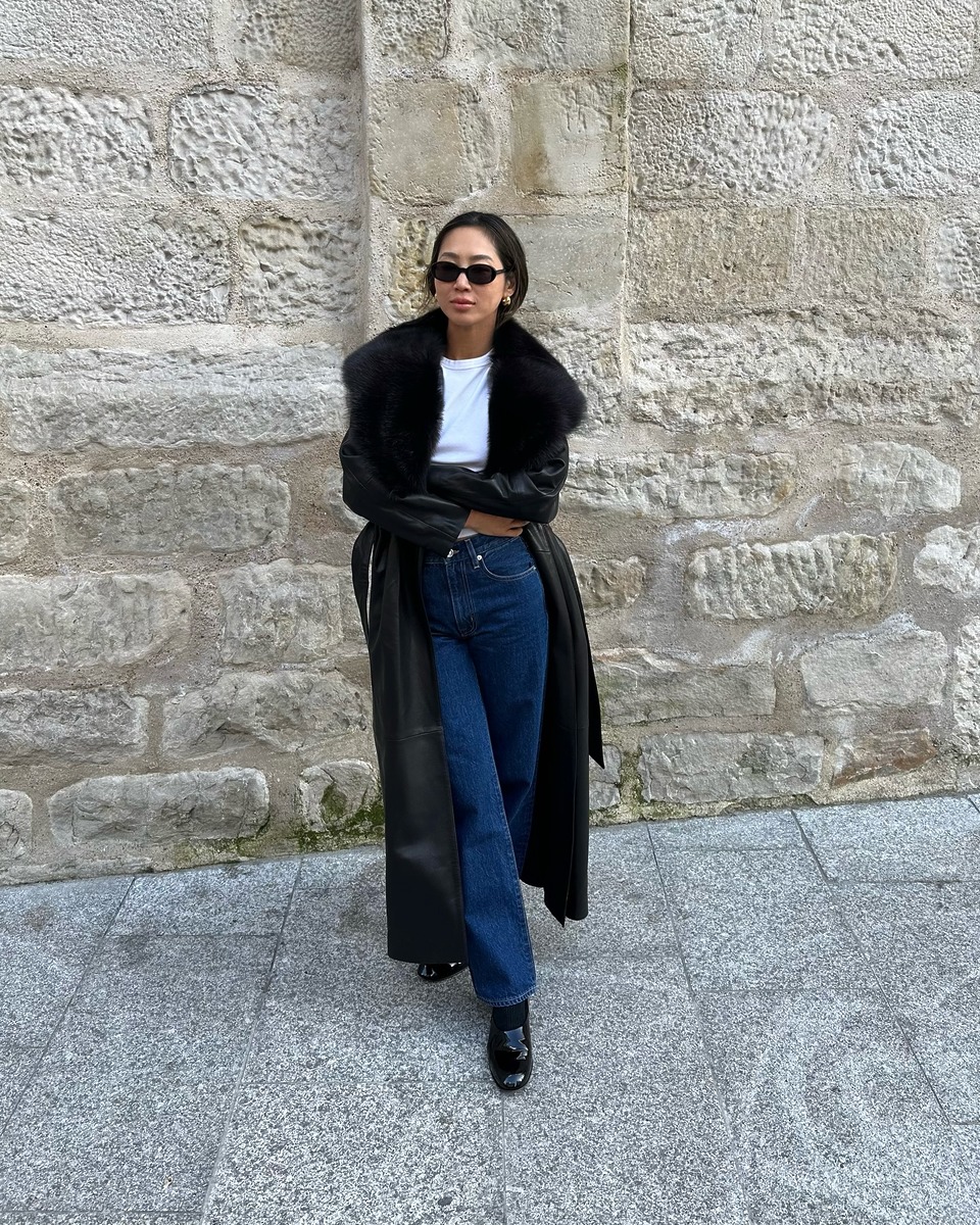 조금 더 고급스러운 무드를 원한다면 퍼 트리밍 디테일이 더해진 레더 코트를 눈여겨보세요. 코트의 카라나 소매에 퍼가 더해진 디자인은 레더 특유의 차가운 인상을 자연스럽게 눌러줍니다. 동시에 룩 전체가 한층 우아해 보이는 효과도 있고요. 이때, 핵심은 퍼는 볼륨감! 퍼가 적당히 풍성해야 레더와 대비를 이루며 고급스러움이 살아나니 주의하세요.