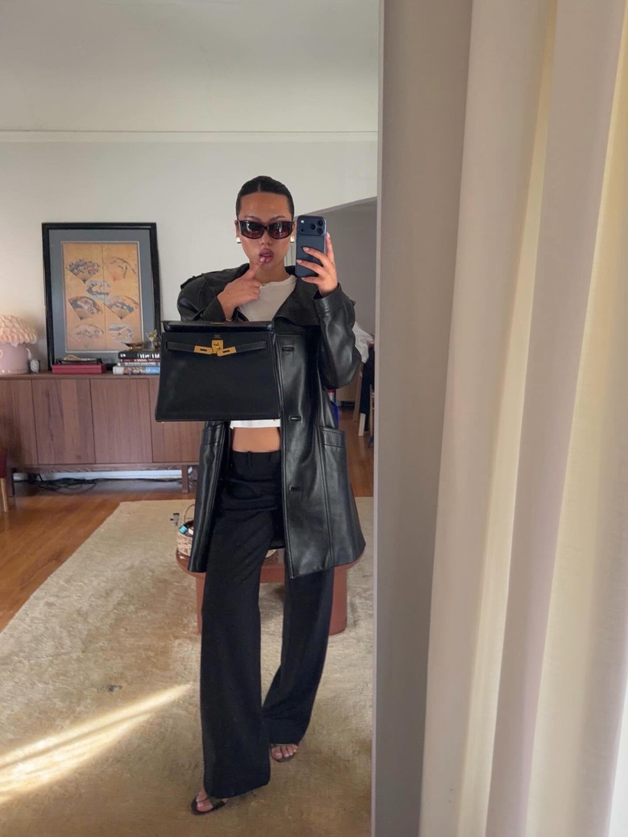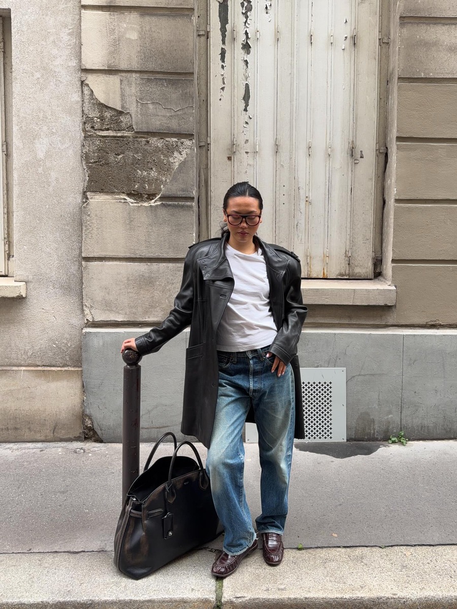 흔히 레더 코트가 강한 아이템이라 오해하기 쉽지만, 의외로 다양한 스타일링에 활용할수 있다는 사실! 블랙 슬랙스에 크롭 톱을 매치하면 포멀하고 시크한 룩이 완성되고, 데님과 화이트 티셔츠를 매치하면 훨씬 캐주얼한 분위기가 되죠. 같은 아우터라도 이너에 따라 전혀 다른 무드를 만들 수 있을 거예요.