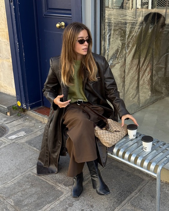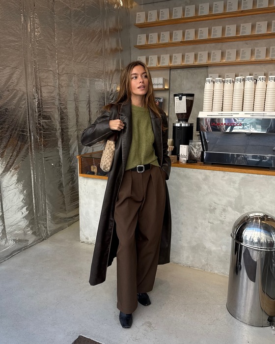 블랙 레더 코트가 부담스럽게 느껴진다면 컬러를 바꿔보는 것도 좋아요. 브라운 레더는 훨씬 부드럽고 따뜻한 인상을 주는 아이템. 올리브 그린 니트에 브라운 슬랙스를 매치하면 안정적인 스타일링이 완성됩니다. 레더 코트가 처음이라면 브라운 컬러로 시작해 보는 건 어떨까요?
