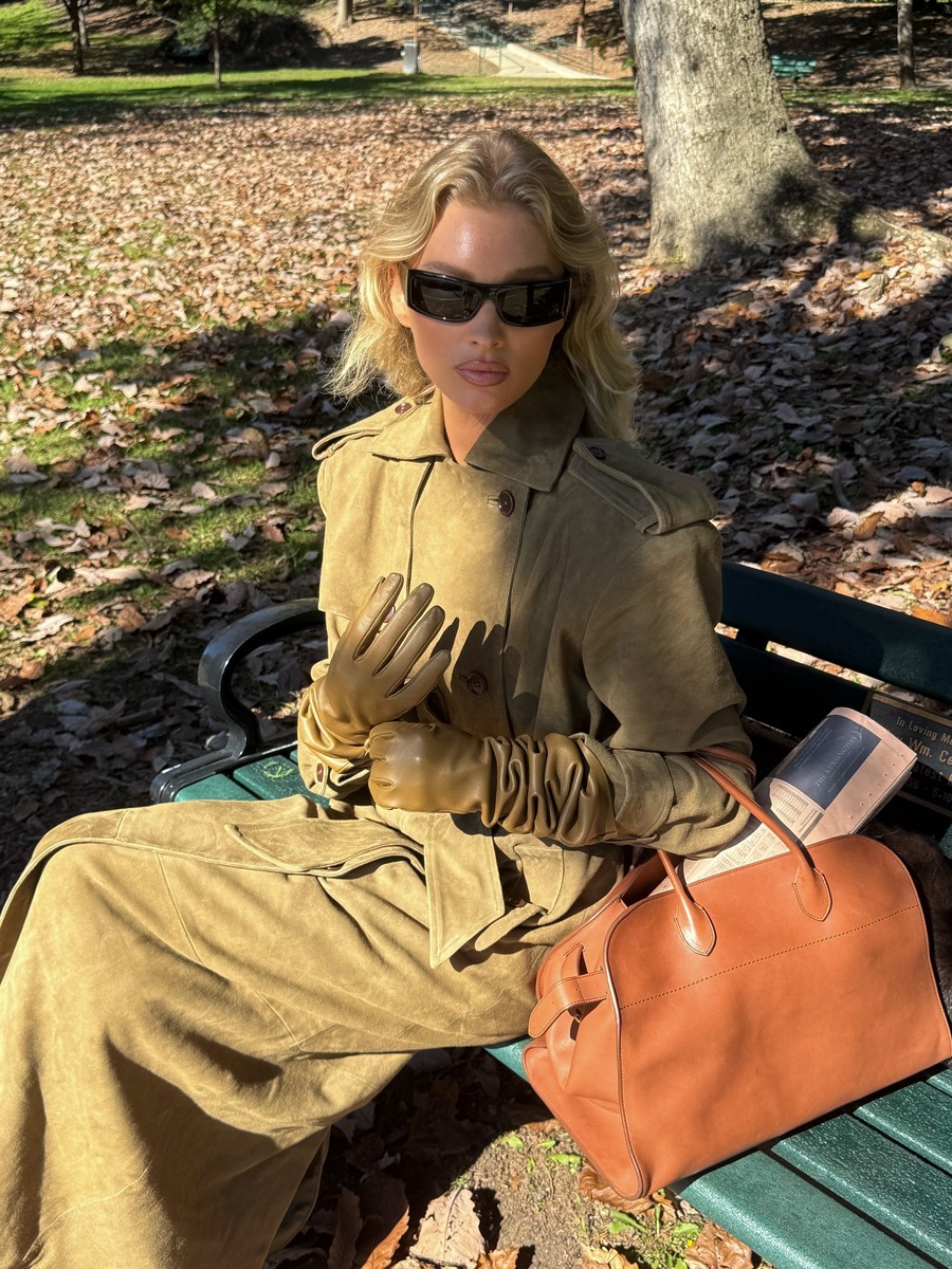 레더라고 해서 꼭 매끈한 가죽만 떠올릴 필요는 없습니다. 스웨이드 소재의 레더 코트는 한층 가볍고 부드러운 착용감을 자랑하죠. 표면의 텍스처 덕분에 훨씬 고급스러워 보이는 것이 스웨이드 소재의 가장 큰 장점. 같은 컬러의 장갑이나 백처럼 작은 액세서리까지 컬러를 맞춰주면 전체 룩의 완성도가 훨씬 높아진다는 것을 기억하세요.