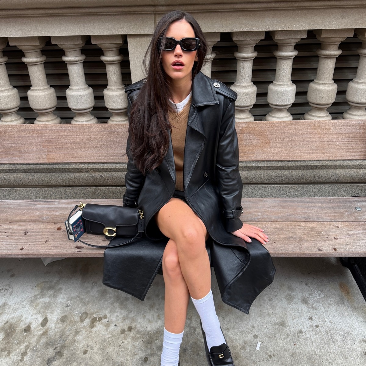 레더 코트는 어둡고 시크한 이미지가 강한 아이템이죠. 하지만 올리비아 닐은 레더 코트의 딱딱한 이미지를 부드럽게 풀어냅니다. 베이지 브이넥 니트에 미니스커트와 로퍼를 더해 걸리시한 무드를 얹었거든요. 레더가 가진 날카로움 위에 미니스커트의 경쾌함이 더해져 균형잡힌 룩이 완성됐어요.