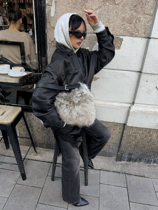 크롭 후드티+바이커 레더 재킷