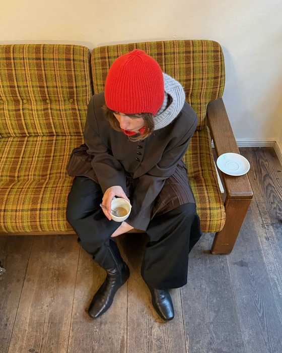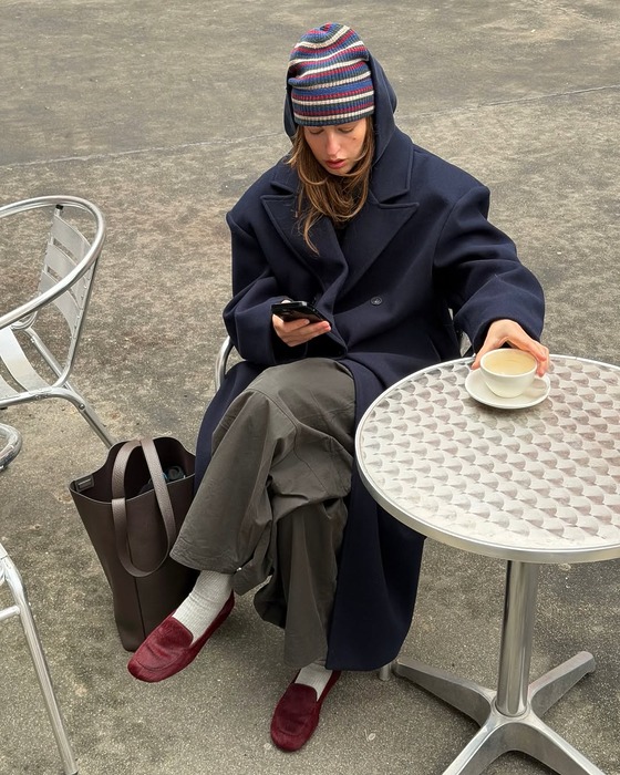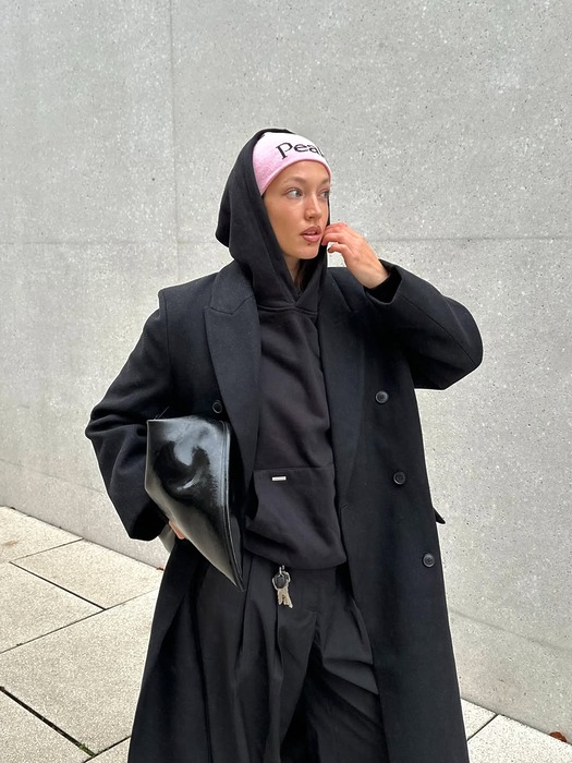 이 조합은 가장 클래식하면서도 실패 확률이 0%. 어깨 각이 확실히 살아있는 넉넉한 핏의 검정, 그레이 코트 안에 핏이 너무 크지 않은 무지 후드티를 레이어드해보세요. 이때 후드티 모자의 끈은 자연스럽게 풀어서 늘어뜨리고, 코트 소매 밖으로 후드티 소매를 살짝 빼주면 시크한 듯 자유로운 느낌 완성! 이때 후드 모자는 등 뒤로 축 처지는 얇은 소재가 아니라, 목 위로 힘 있게 봉긋하게 서는 탄탄한 소재를 고르세요. 후드 각이 살아 있어서 얼굴을 작아 보일 수 있어요.