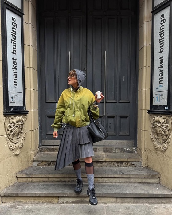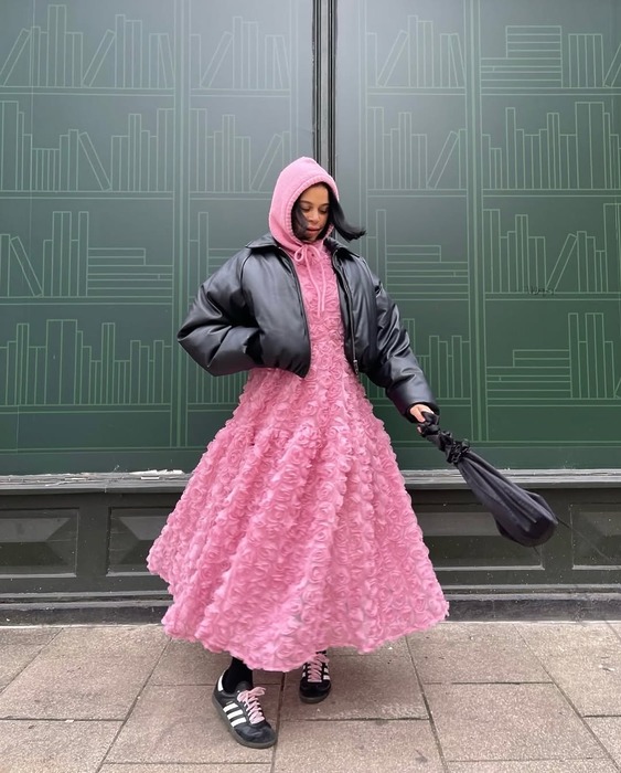 후드티에는 바지라는 공식을 깨보세요. 기장이 살짝 짧은 후드티, 러블리한 컬러의 롱스커트나 로맨틱한 디테일이 들어간 스커트를 매칭해보세요. 여기에 투박한 바이커 부츠나 빈티지한 레더 숄더백을 더하면 언밸런스한 듯 힙한 스타일링이 완성된답니다.