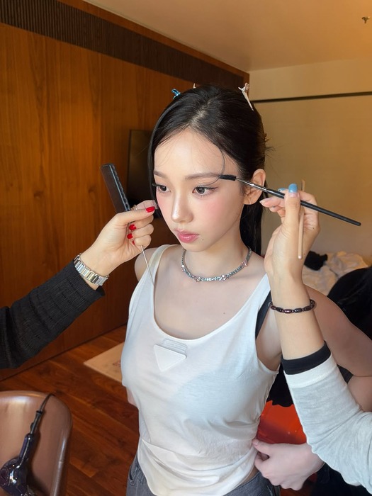 고윤정, 카리나 두 사람의 메이크업 특징은 화려한 컬러 대신 속눈썹, 눈썹 같은 ‘결’을 살리는 마이크로 디테일이에요. 진하고 두꺼운 아이라인 대신, 속눈썹을 가닥가닥 뭉쳐 올려 인형처럼 또렷한 눈매를 만들어요. 또 눈썹 역시 빈 곳만 가볍게 채우고 투명 마스카라로 눈썹 앞머리의 결을 한 올 한 올 살려 입체감 있게 살려주죠.