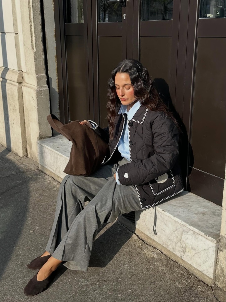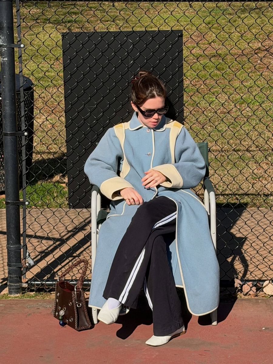 조금 더 위트를 더하고 싶다면 트랙 팬츠에 화이트 플랫을 매치하는 것도 좋은 선택지입니다. 여기에, 블루 코트까지 걸치면 캐주얼과 단정함이 동시에 살아납죠. 운동화 대신 플랫을 선택하는 순간, 전체적인 룩이 정돈되어 보이고 스포티한 팬츠를 플랫의 단정함이 눌러주면서 한층 세련된 무드가 완성됩니다.