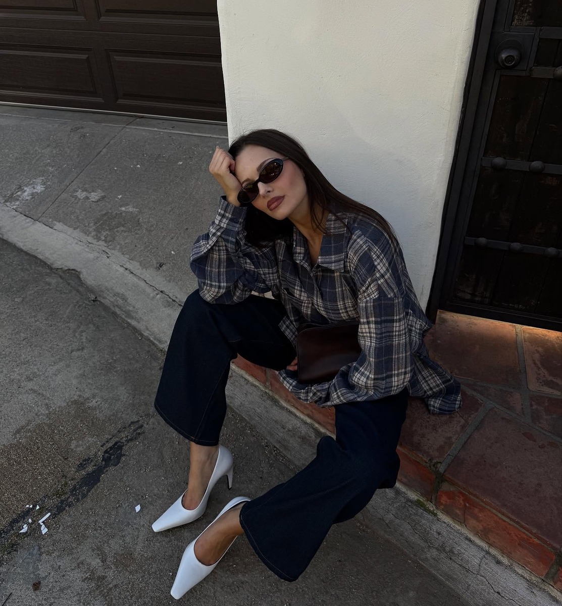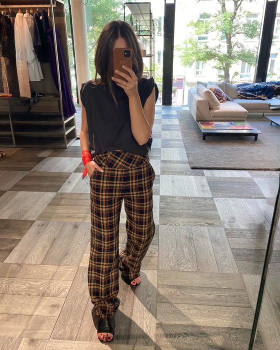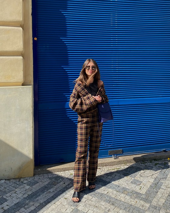브라운 톤의 체크 패턴은 차분한 분위기를 만들어줘요. 주름 잡힌 브라운 톤의 와이드 슬랙스 핏에 브라운과 블루가 섞인 체크 블라우스를 매치하면 포멀한 룩을 완성할 수 있죠. 여기에 빅 백까지 들면 단번에 오피스룩으로 변신할 수 있답니다.