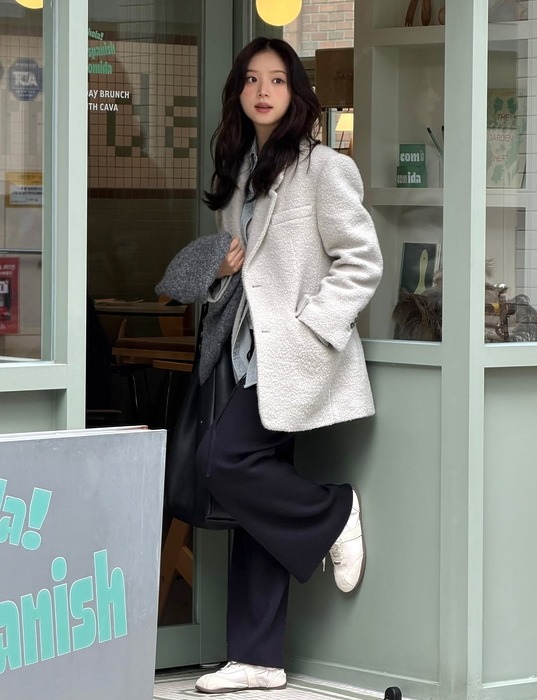 어깨 라인이 드롭되고 품이 넉넉한 실루엣으로, 기존 트위드 재킷보다 자유롭고 쿨한 느낌을 주죠. 넉넉한 핏 덕분에 체형 보정에 효과적이고 이너를 두껍게 입어도 간절기에 활용도가 높아요. 또 하의는 데님이나 조거 팬츠 같은 스타일도 잘 어울려요. 단, 키가 작거나 왜소한 체형은 재킷에 파묻힌 듯한 느낌을 줄 수 있어 하의를 짧거나 타이트하게 매칭해서 다리 라인을 드러내주면 오버핏의 쿨한 매력이 상승한답니다.