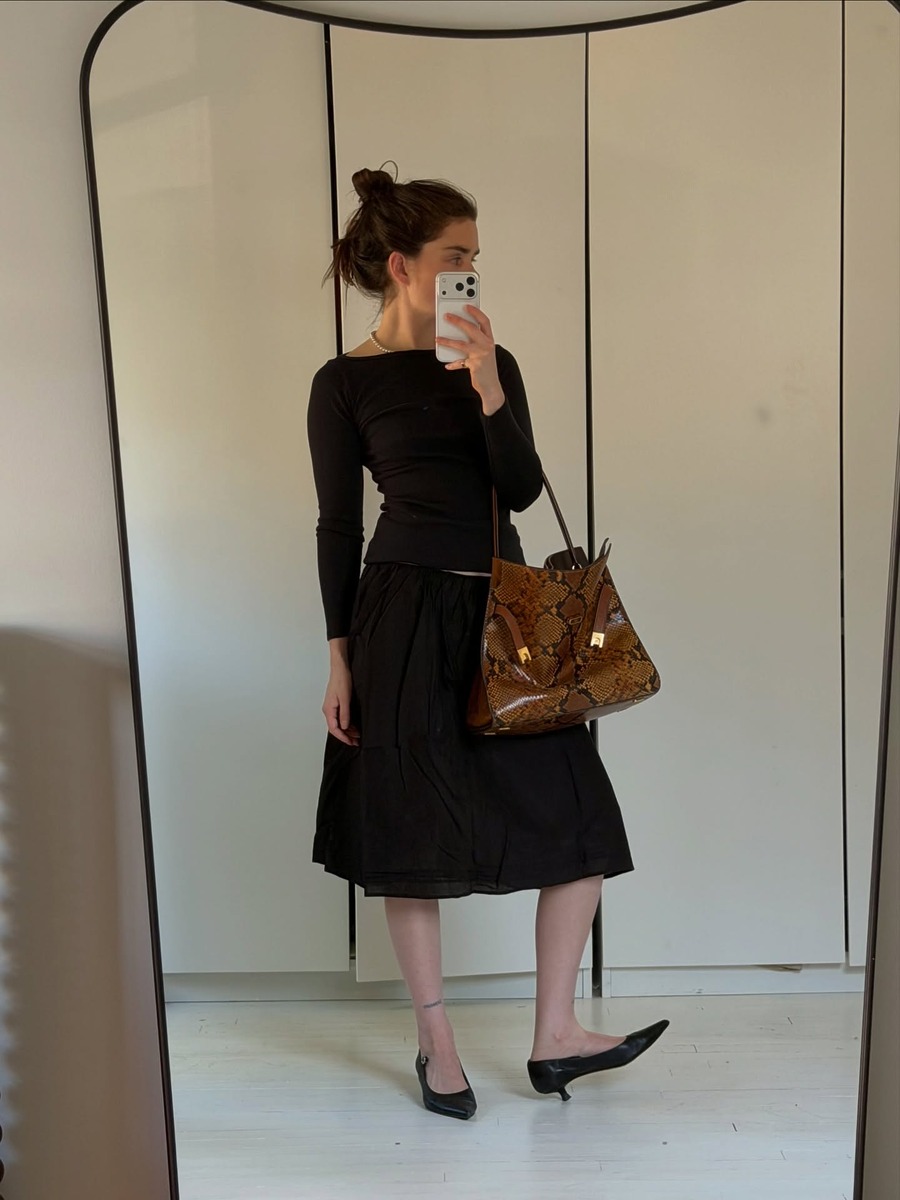 군더더기 없이 깔끔한 라인과 블랙 컬러가 주는 단정함이 매력적인 블랙 롱슬리브지만, 때론 다소 밋밋하게 느껴질 때도 있죠. 그럴 땐 액세서리에 힘을 줘 보는 건 어떨까요? 채도 높은 레드 컬러 미니 백이나 페이턴트 패턴의 숄더백을 함께 매치해 과하지 않은 포인트를 더해 보세요.