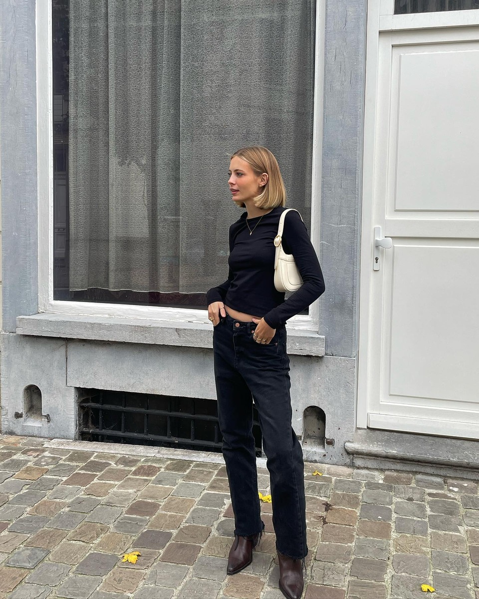 롱 슬리브 티셔츠는 반팔 티셔츠가 가지지 못한 우아함이 매력적이죠. 중요한 저녁 약속을 앞두고 있을 때도 블랙 롱 슬리브는 제 역할을 톡톡히 해냅니다. 특히, 보트넥처럼 넥라인이 가로로 길게 파진 디자인을 선택하면 목선에 자연스럽게 시선이 가 전체적인 무드가 훨씬 고급스러워지죠. 여기에, 볼드한 사이즈의 귀걸이와 반지로 화려함을 더하고 로우 웨이스트 데님으로 살짝 힘을 빼주면 캐주얼함과 우아함을 모두 잡은 스타일링이 완성됩니다.