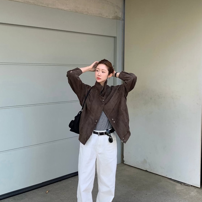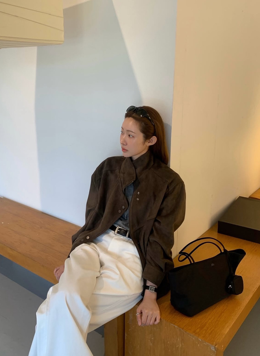 올봄 트렌드 아이템은 바로 스웨이드 소재의 봄버 재킷이라고 할 수 있어요. 봄버 재킷은 목 부분과 소매, 점퍼 밑단의 시보리가 특징인데 스웨이드 봄버 재킷은 조금 다른 형태로 발전되었죠. 포켓 디테일이나 밑단 시보리로 봄버의 특성을 어느 정도 유지하면서 러프한 느낌을 다듬어 한층 세련된 것이 특징이에요. 브라운이나 카멜 톤의 스웨이드 봄버 재킷은 화이트 팬츠와 매치하는 것이 패피들의 스타일링 포인트!