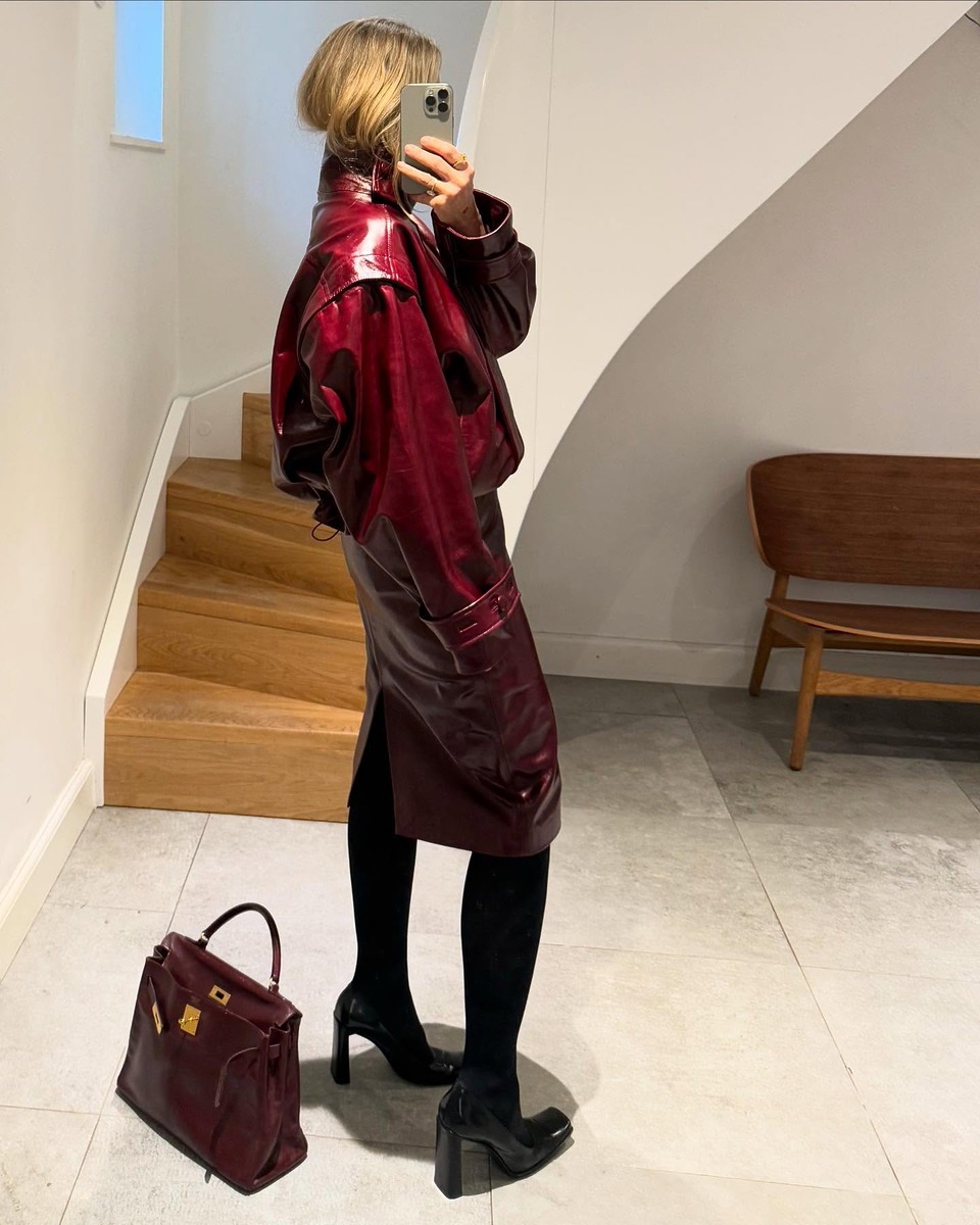 런웨이에서 막 걸어 나온 듯 강렬한 느낌을 원한다면 광택감 있는 가죽을 선택하는 것을 추천해요. 블러드 레드 컬러의 유광 가죽 봄버에 비슷한 톤의 레더 스커트와 백을 함께 코디하면 시크하고 섹시한 느낌까지 연출할 수 있답니다.
