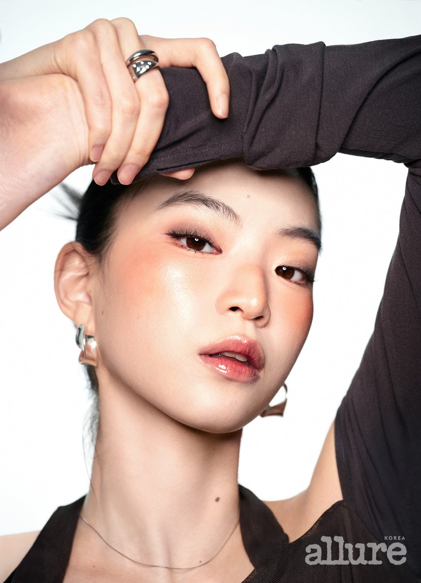 EYES 시머한 펄이 들어간 베이지 컬러 섀도를 눈두덩 전체에 바르고 쿨한 핑크 섀도를 레이어링한다. 치크에 사용한 블러셔를 눈두덩에서 시작해 볼까지 연결되도록 쓸어준다.