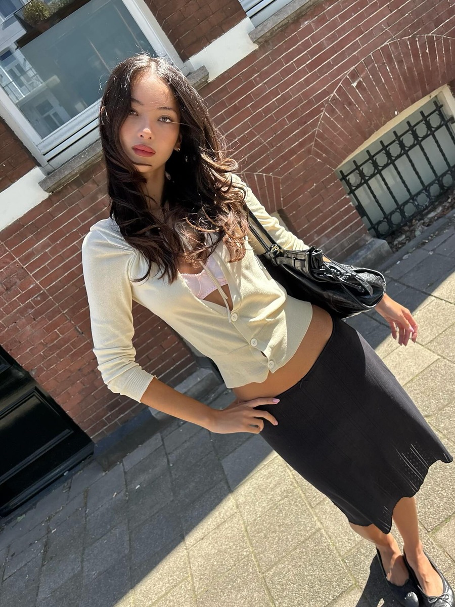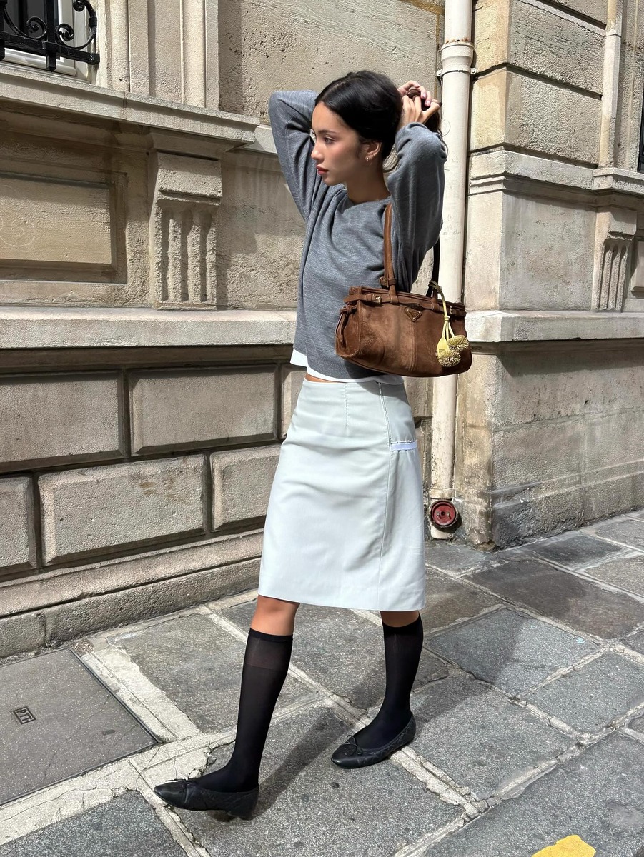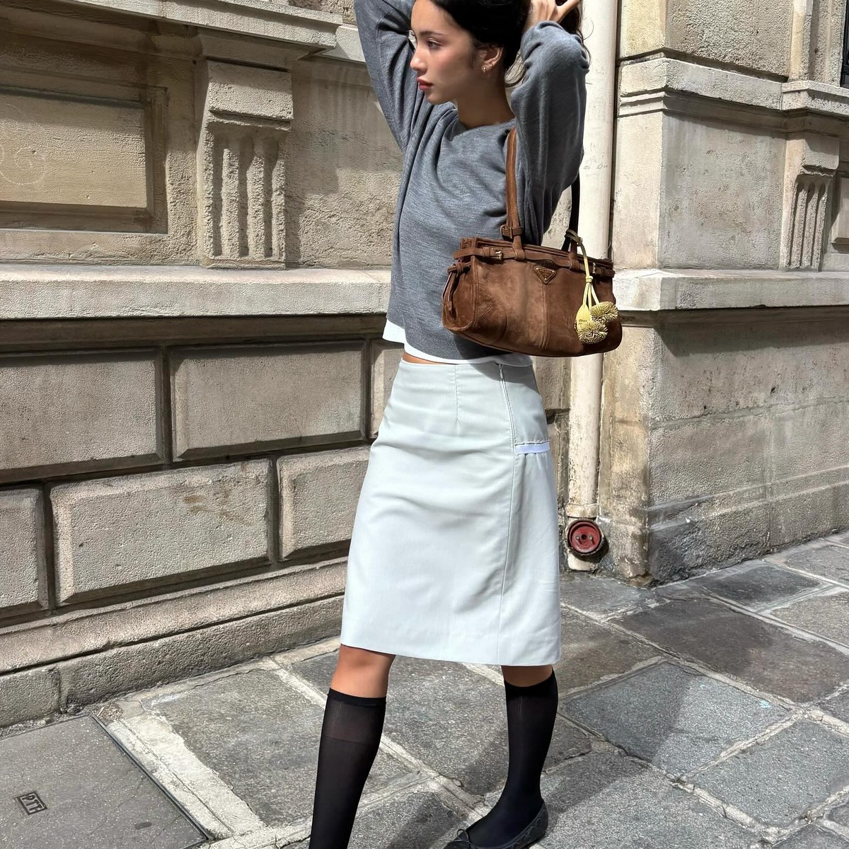 무채색 미디 스커트는 생각보다 훨씬 유용한 아이템입니다. 니트나 카디건을 매치하는 것만으로도 우아하고 차분한 룩이 완성되거든요. 포인트는 로우 웨이스트 디자인을 선택해 허리가 살짝 드러나게 연출하는 것! 이렇게 하면 답답함 없이 한층 세련된 인상을 줄 수 있어요. 슈즈는 플랫슈즈로 가볍게 연출하고 니삭스를 더하면 단정함 속에 걸리시한 포인트가 살아납니다.