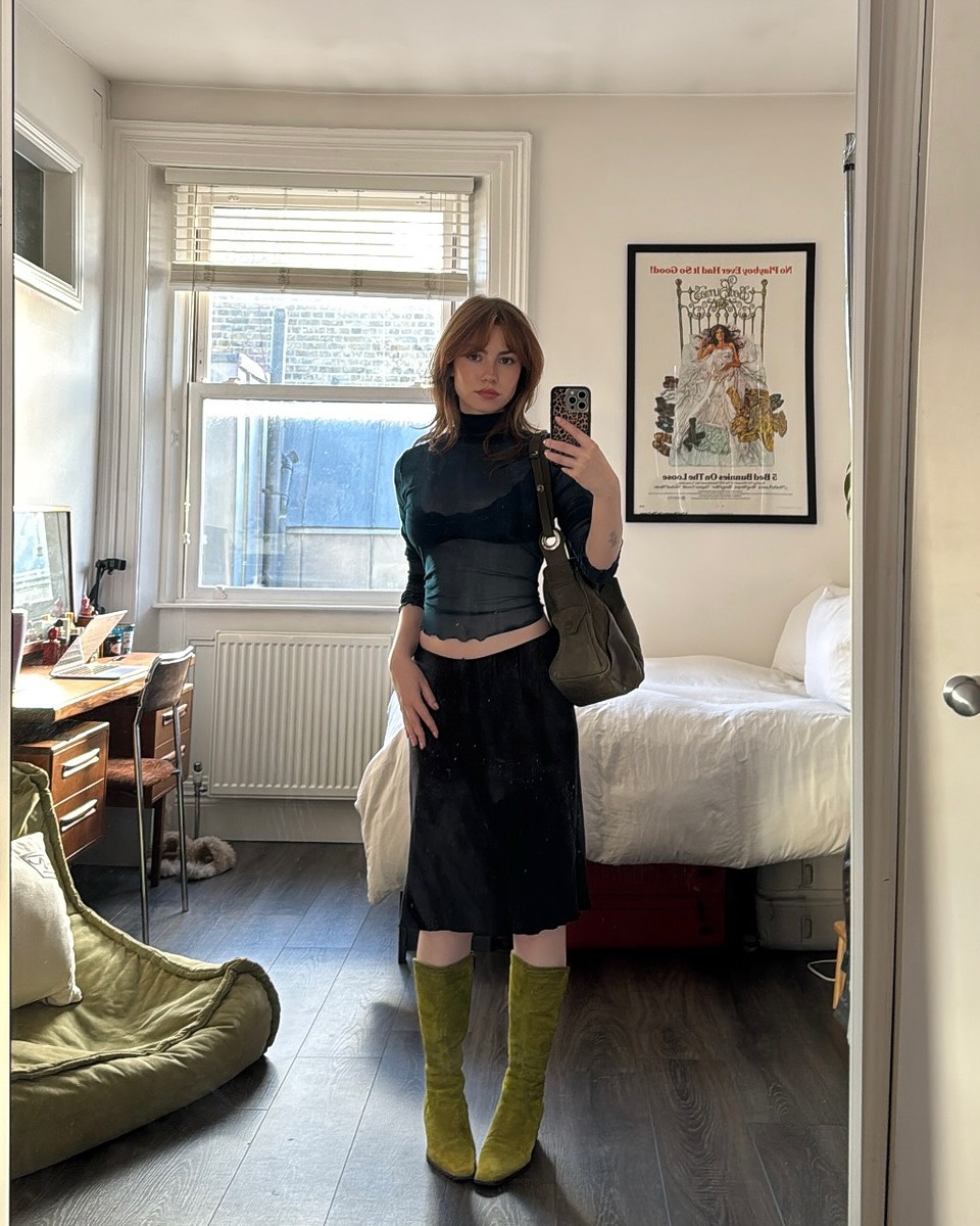 미디 스커트엔 으레 플랫이나 납작한 스니커즈를 떠올리지만, 부츠를 매치하면 전혀 다른 분위기가 완성됩니다. 단, 길이가 애매한 부츠는 다리가 굵어 보일 수 있으니 주의하세요. 스커트보다 살짝 짧은 부츠를 신거나, 아예 롱부츠를 선택해 스커트 자락이 자연스럽게 덮이도록 연출하는 것이 핵심입니다. 부츠의 부피감이 중심을 잡아 줘 한층 시크한 무드가 살아납니다.
