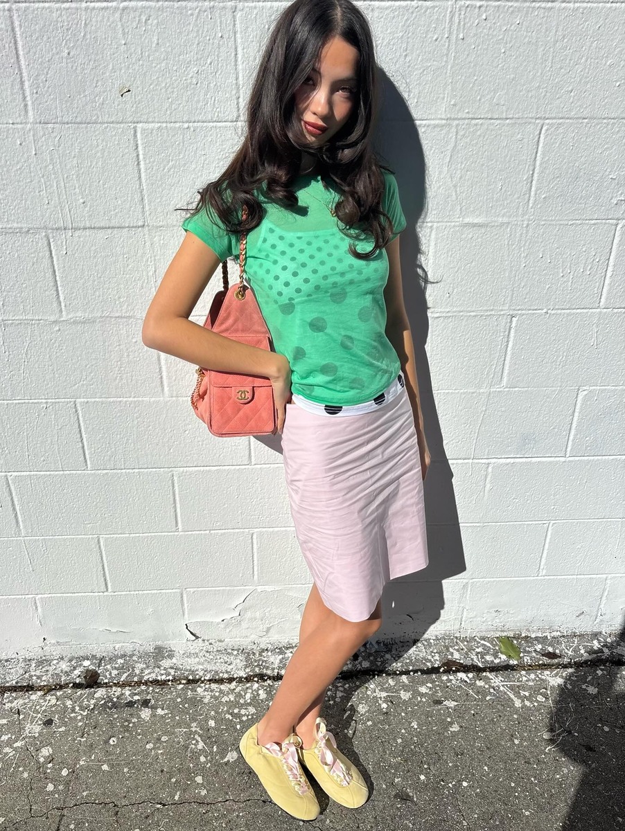 컬러가 들어간 미디 스커트는 봄을 가장 직관적으로 드러내는 아이템입니다. 핑크 스커트에 그린 티셔츠, 옐로 스니커즈처럼 파스텔 컬러를 과감하게 믹스해 보세요. 컬러는 다르지만, 톤을 비슷하게 맞춰 통일감을 주는 것이 포인트입니다. 여기에 도트나 스트라이프 같은 작은 패턴을 더하면 스타일링의 완성도가 훨씬 높아집니다. 약간의 용기만 있다면 컬러 플레이도 생각보다 어렵지 않답니다.