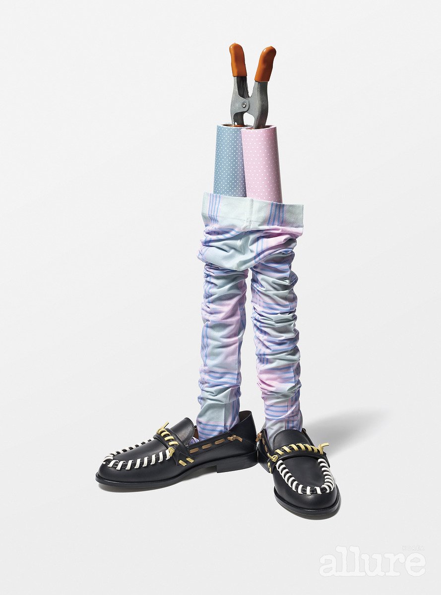 파스텔컬러의 체크 패턴 스타킹은 3만6천원 타입서비스(Typeservice). 레더 스티치 장식 로퍼는 가격미정 토즈(Tod’s).