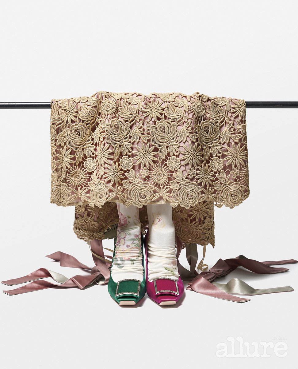 (위부터) 크로셰 드레스는 가격미정 발렌티노(Valentino). 플로럴 모티프 스타킹은 5만2천원 오픈와이와이(Open Yy). 상징적인 ‘벨 비비에’ 버클을 장식한 그린과 핑크 컬러 ‘트럼펫’ 펌프스는 2백20만원대 로저 비비에(Roger Vivier).