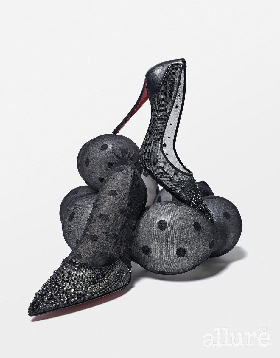 메시 소재에 큐빅과 진주를 수놓은 펌프스 힐은 2백30만원대 크리스찬 루부탱(Christian Louboutin). 스타킹은 에디터 소장품.