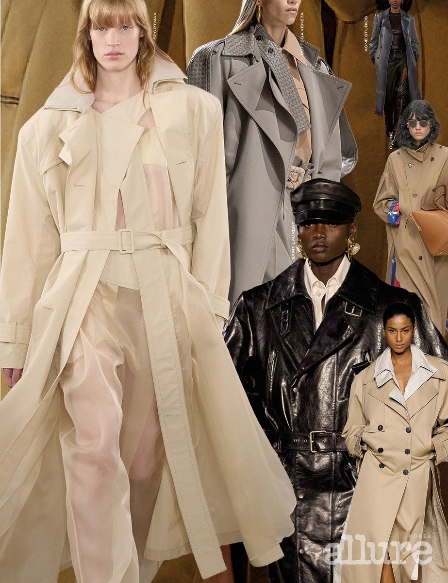 트렌치코트가 전통적인 형태에서 벗어났다. 맥시 길이로 늘어뜨리거나, 허리선을 강조해 드레스처럼 입는다. 크롭트 재킷으로 분리하거나 상하의를 셋업처럼 나눈 디자인도 선보였다. 더블브레스트의 전통적인 구조는 유지하되, 소매 볼륨이나 칼라 크기를 과감히 조정한 것. 클래식 아이템이지만 변형의 폭은 어느 때보다 넓다.