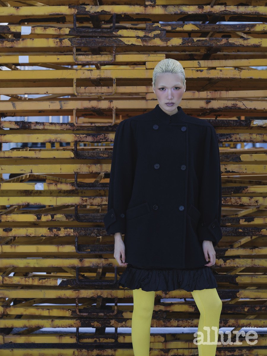 울 하이넥 더블브레스트 코트, 프릴 스커트는 끌로에(Chloe). 레깅스는 오니츠카타이거(Onitsuka Tiger).