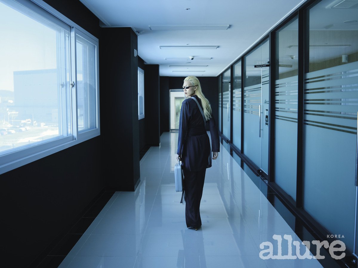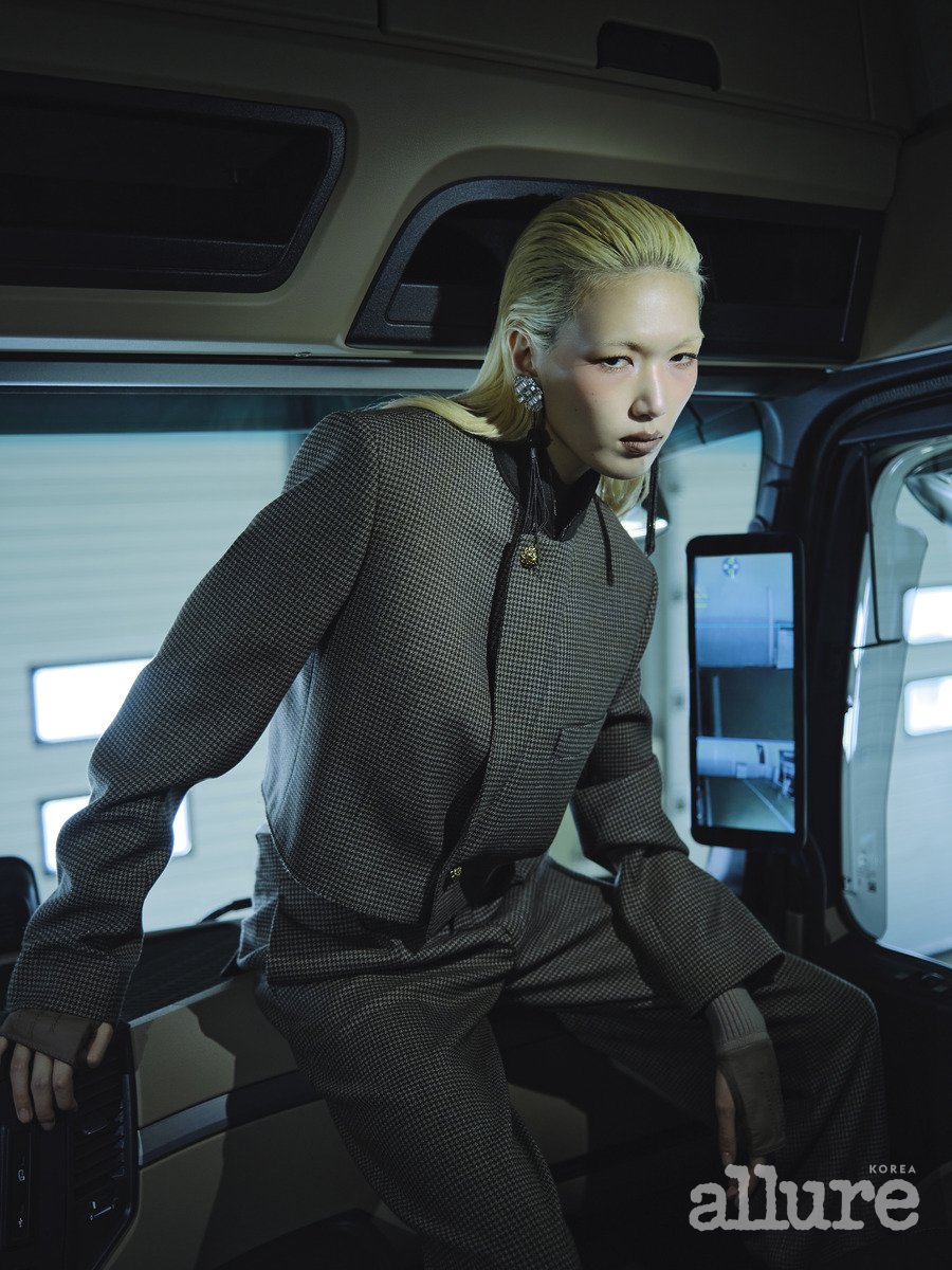 울 소재 크롭트 재킷과 팬츠는 샤넬. 태슬 드롭 이어링은 페라가모. 핑거리스 글러브는 에르메스.