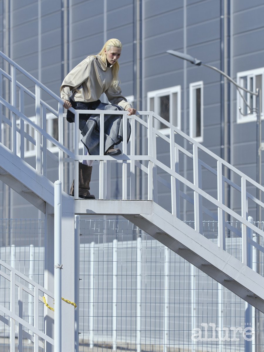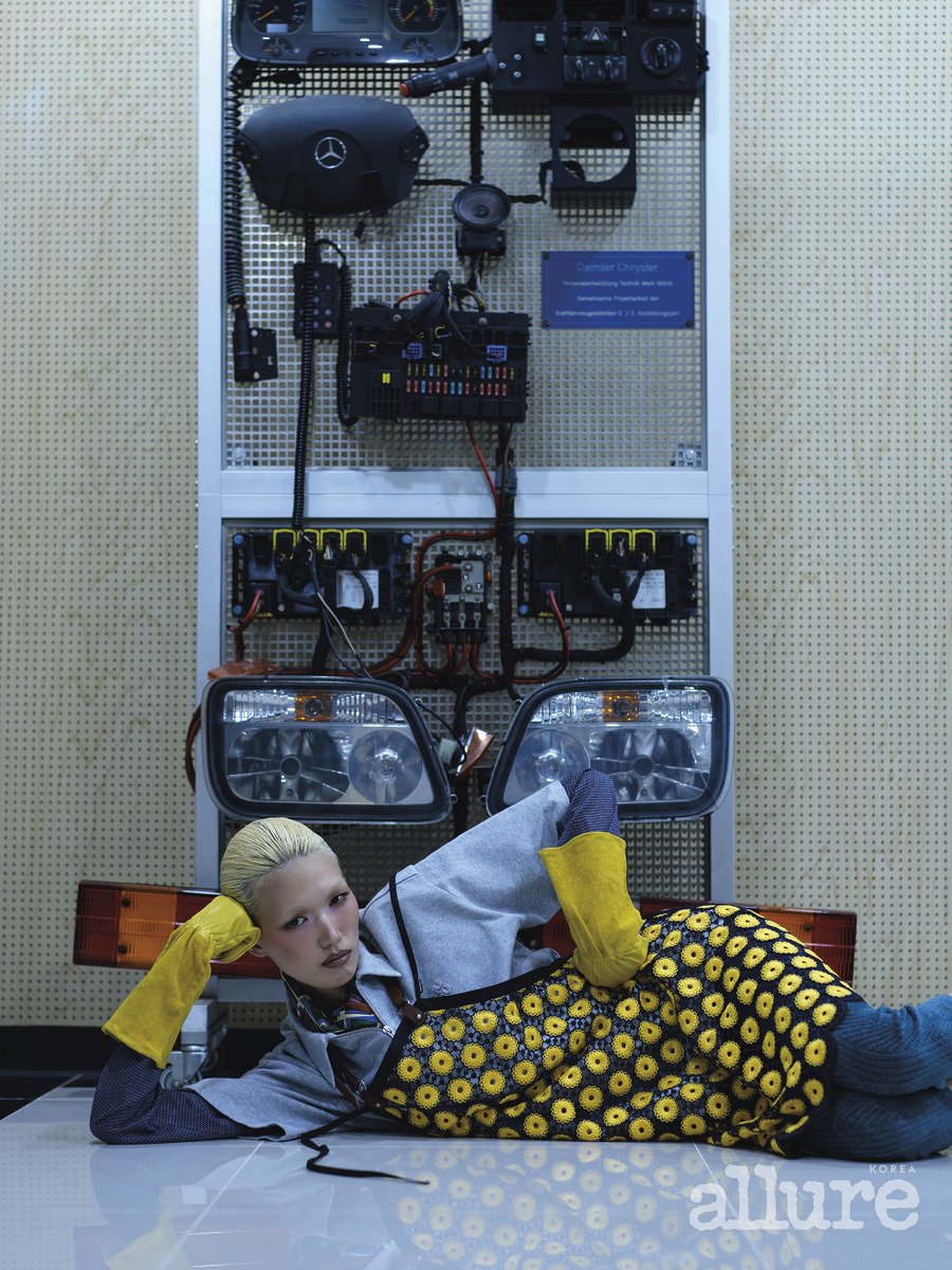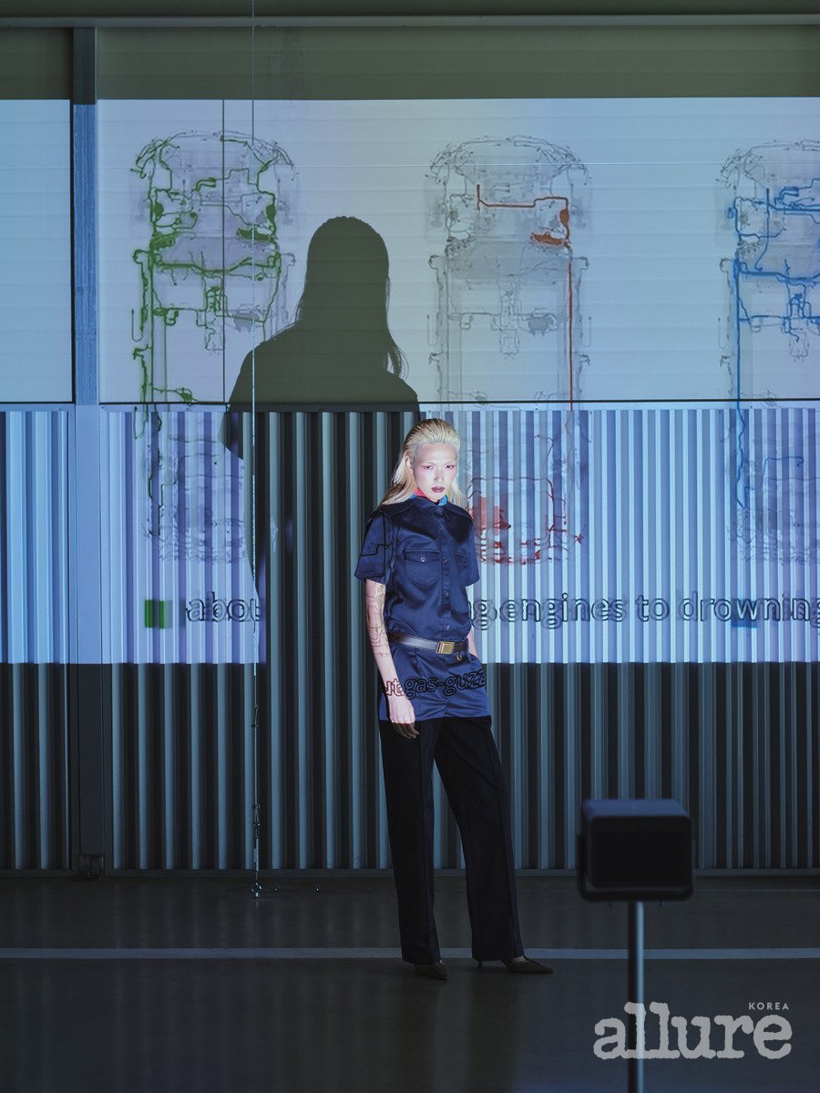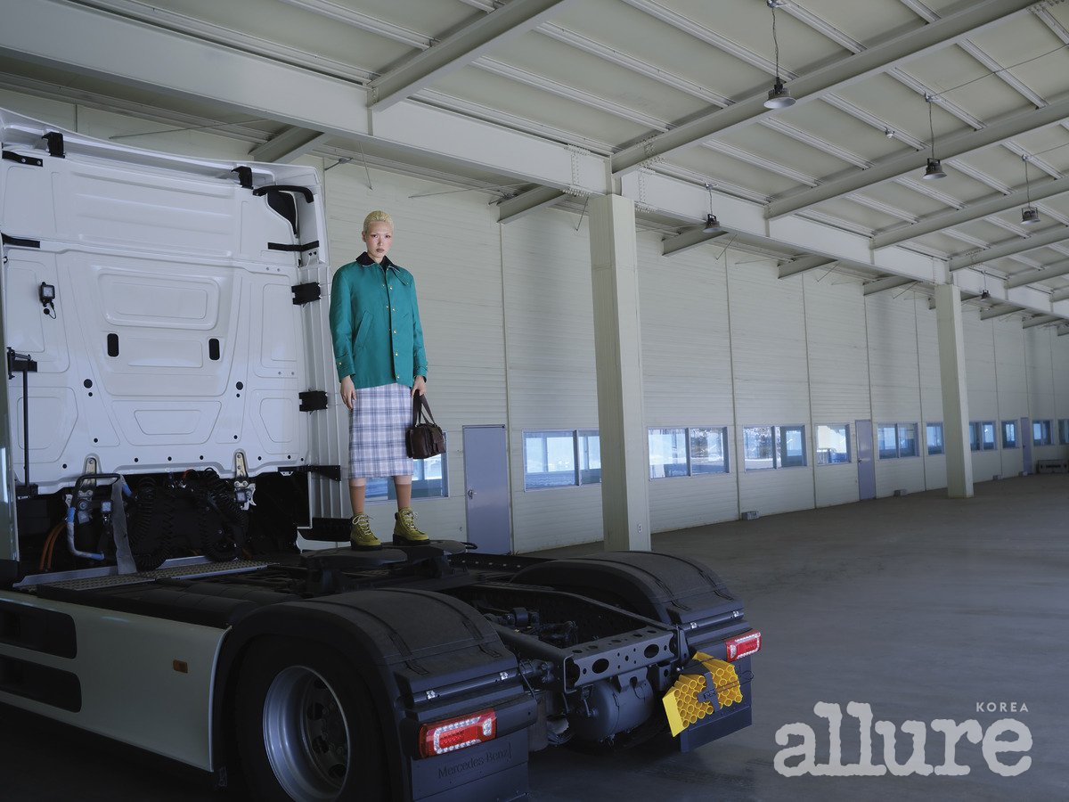 이부직 새틴 소재의 점퍼는 렉토(Recto). 이중 레이어드 스타일의 생지 데님 스커트는 준지(Juun.J). 스웨이드 컴뱃 부츠는 디아티코(The Attico).