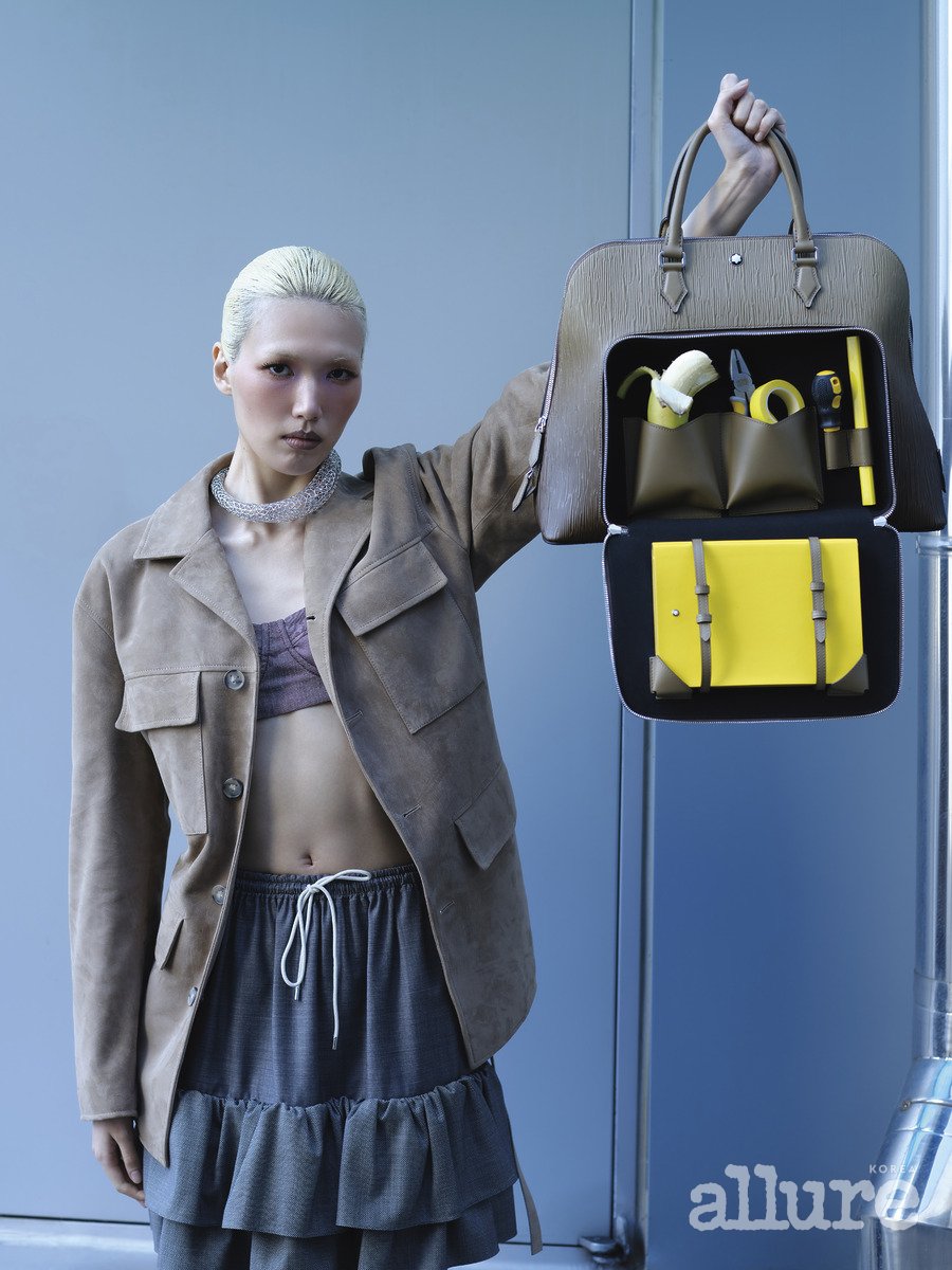 스웨이드 사파리 재킷은 토즈. 뷔스티에 브라톱은 롱샴. 드로스트링 디테일의 러플 스커트는 루이 비통(Louis Vuitton). 모래색 코르테치아 가죽으로 제작한 트래블러 핸드백, 사피아노 레더 노트는 몽블랑(Montblanc). 건축 구조물에서 영감 받은 스털링 실버 소재 네크리스는 톰우드.