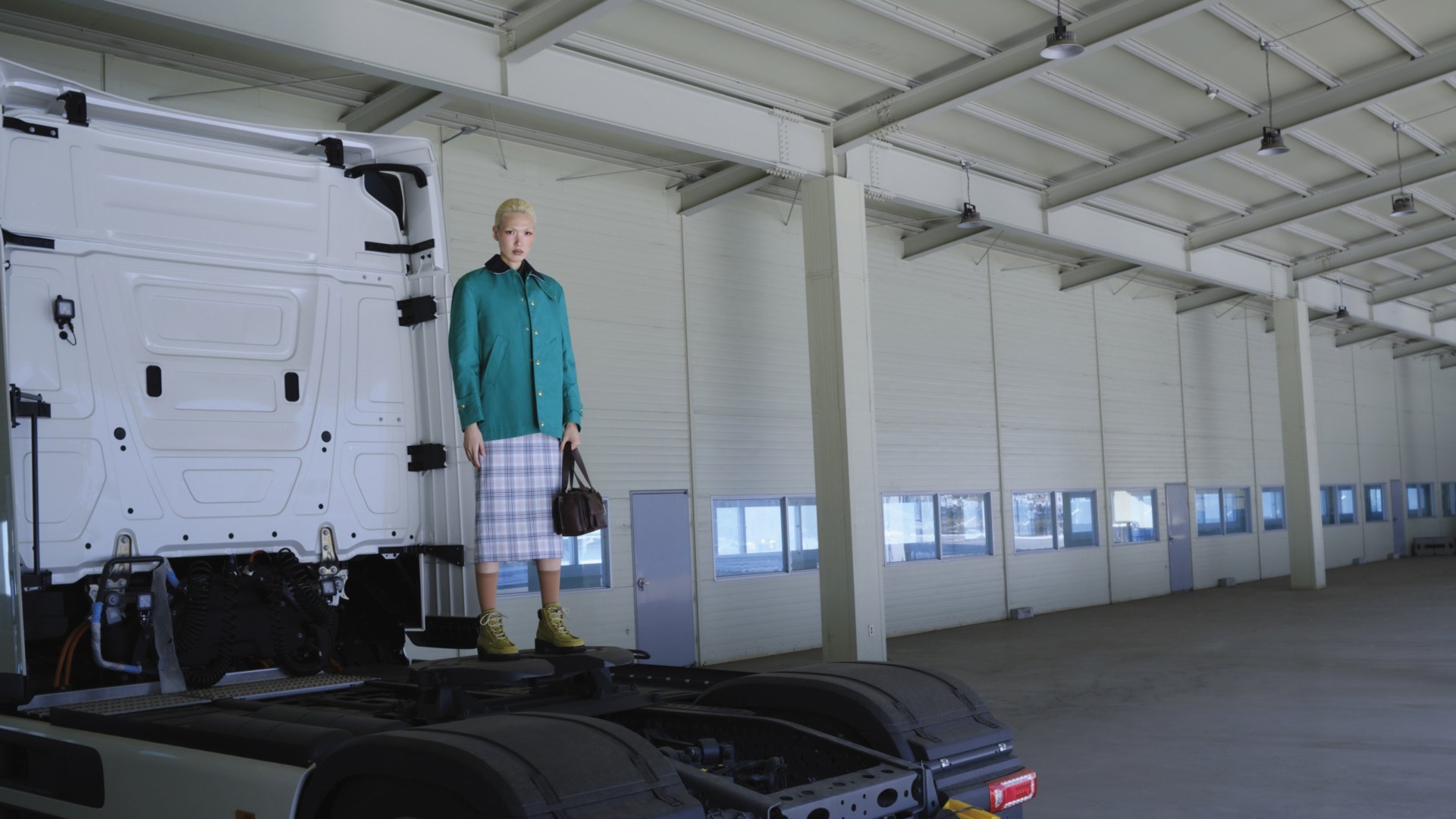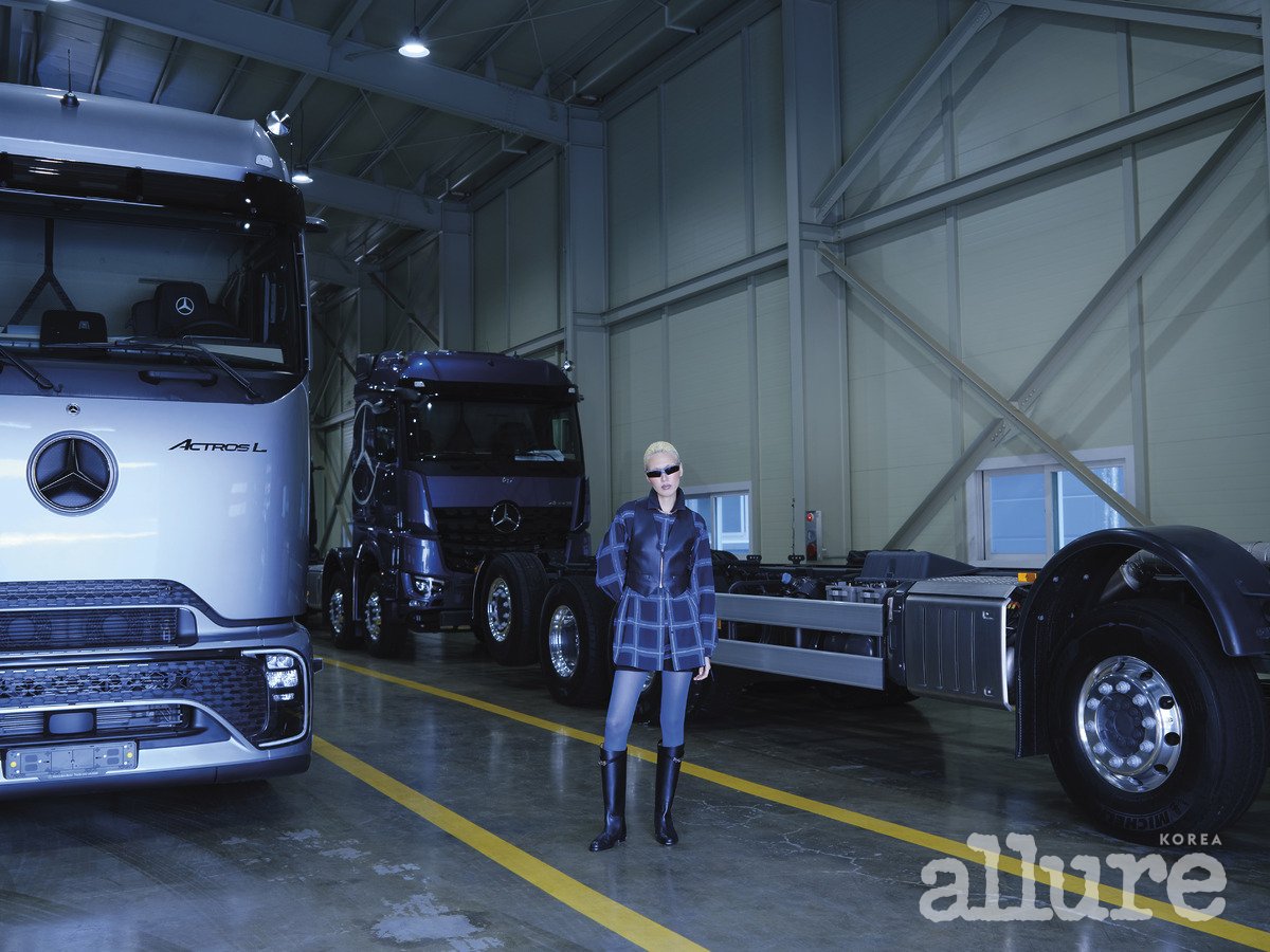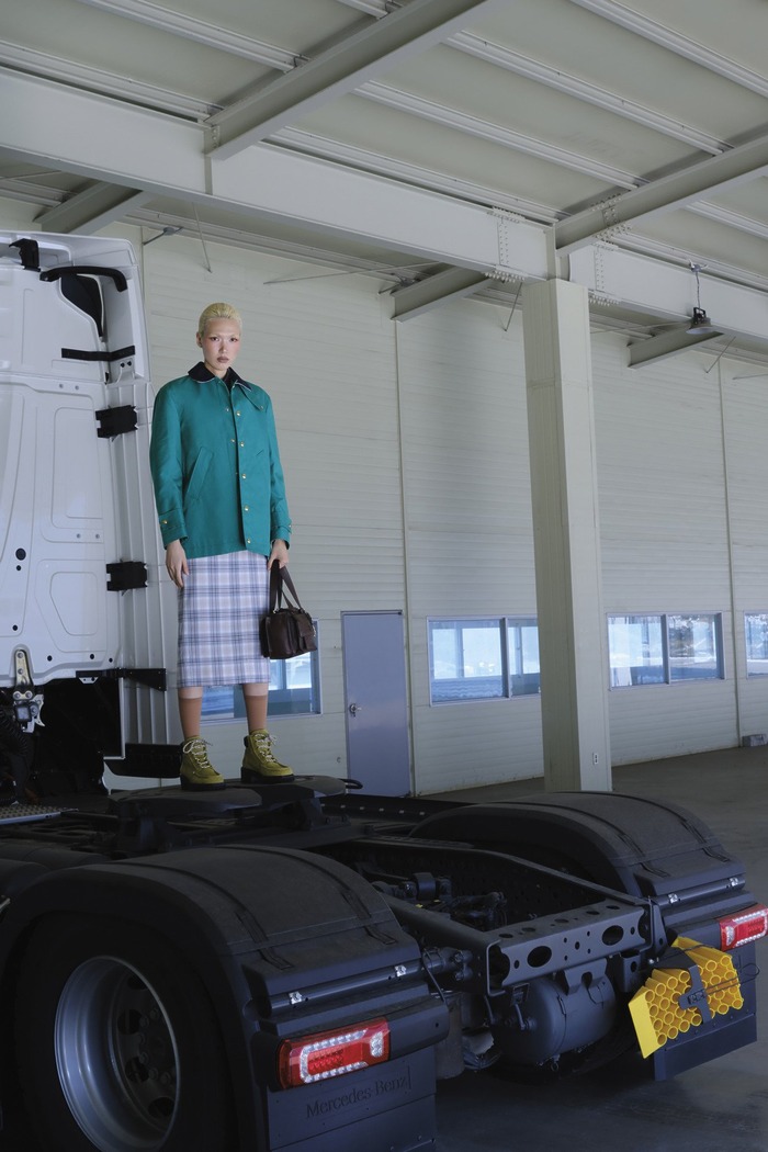 내구성이 뛰어난 코듀라 나일론 소재 오버코트, 윈도페인 플래드 체크 패턴 스커트는 톰 브라운(Thom Browne). 유틸리티 쇼퍼 백은 미우미우. 스웨이드 컴뱃 부츠는 롱샴(Longchamp).