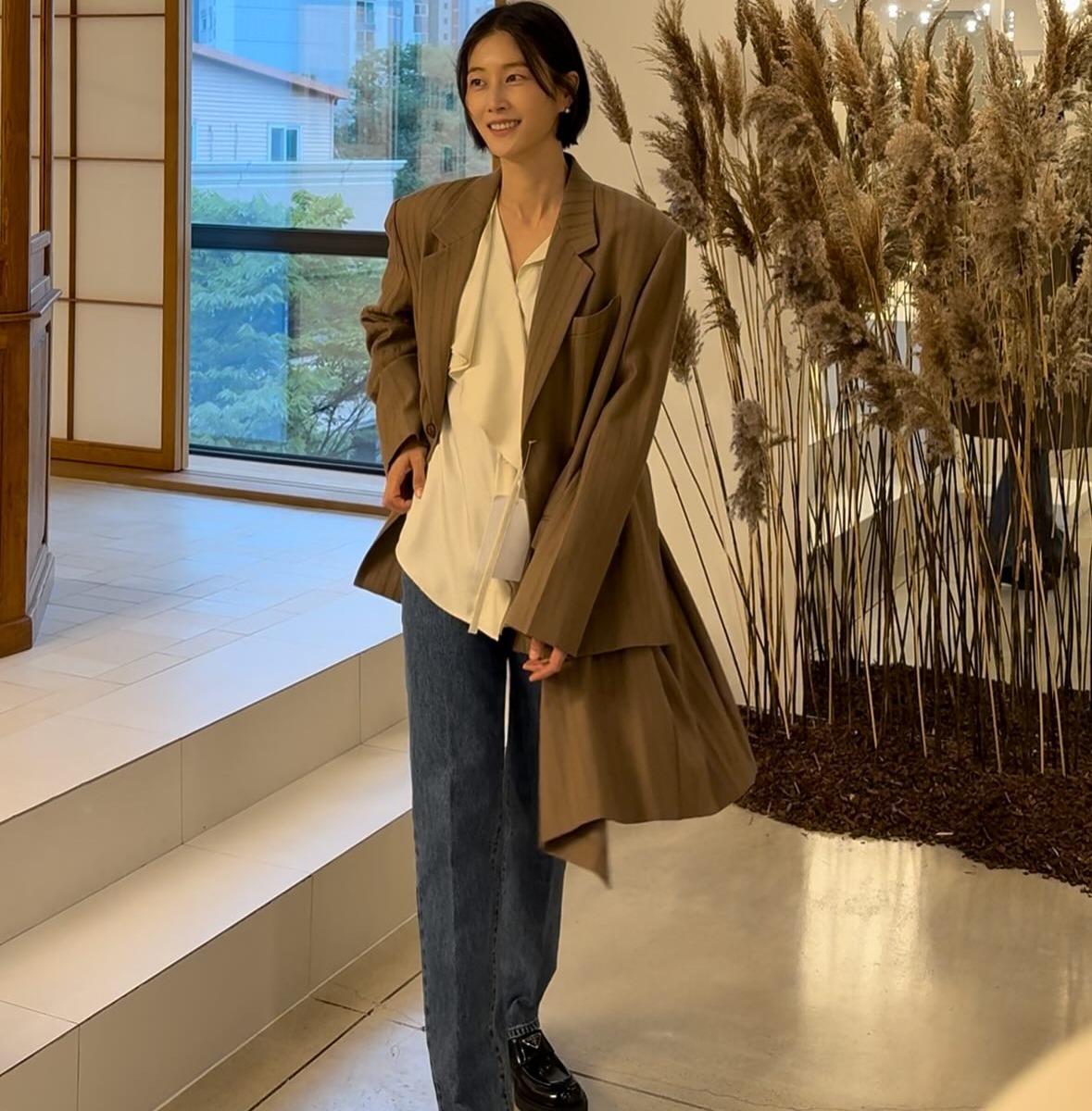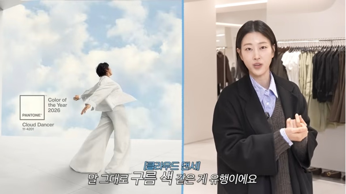 구름 같은 하얀색. 이현이는 올해의 컬러 클라우드 댄서를 팬츠로 선택하고, 오트밀 컬러 봄버 재킷으로 깔끔하고 단정한 학부모 룩을 완성했습니다.