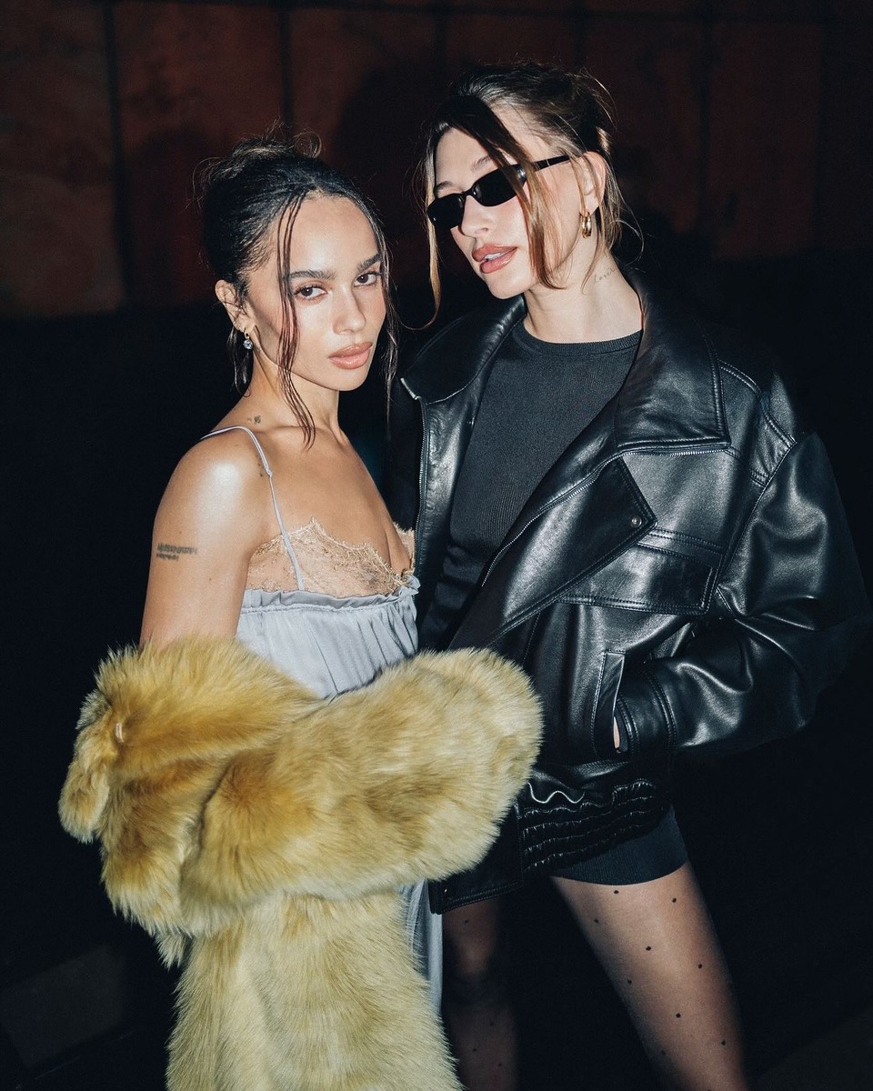 유행하는 오버 사이즈 레더 재킷이 무겁게 느껴진다면 헤일리의 하의 실종 룩을 참고하세요. 몸에 밀착되는 미니 드레스에 도트 패턴 시스루 스타킹에 아찔한 스틸레토. 볼드한 골드 이어링을 더하니 파티룩으로도 손색 없죠.