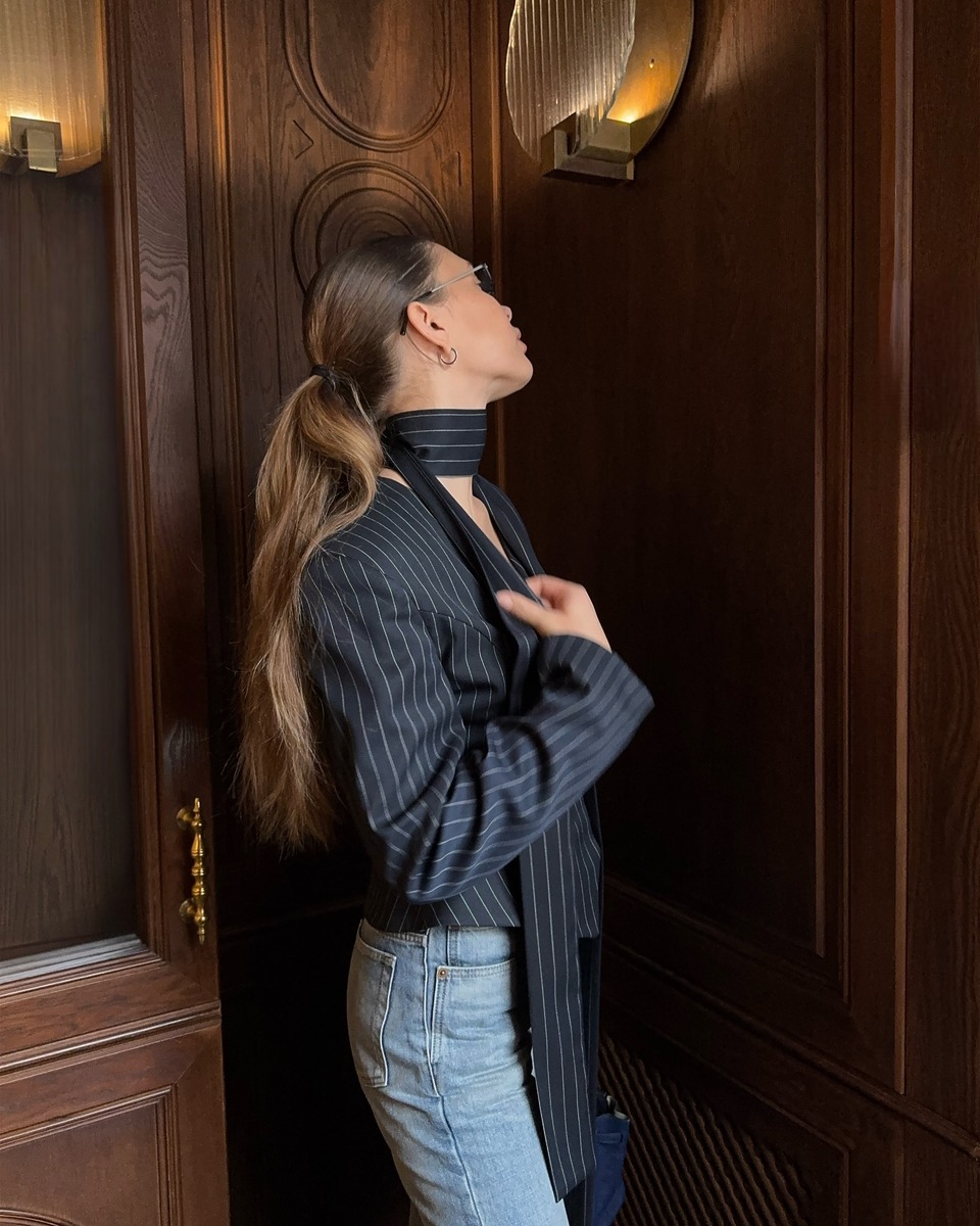 재킷처럼 살짝 도톰한 소재의 블라우스도 추천. 브이넥으로 깊게 파인 이 블라우스에는 같은 소재로 제작된 긴 스카프를 목에 감아 허전한 넥 라인을 우아하게 채울 수 있죠.