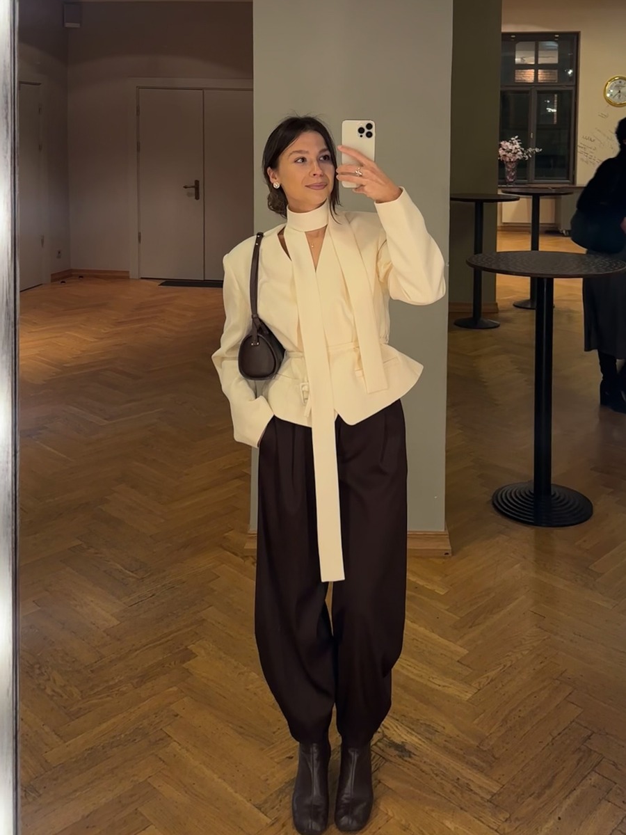 특별한 날에는 우아한 드레이핑이 가득 잡힌 셔링 블라우스를 입어보는 건 어때요? 시어한 소재로 가벼움을 더하고 자연스럽게 흐르는 결들이 고급스러운 무드를 더하죠. 레드로 강렬한 포인트를 주어도 좋고, 화이트나 아이보리 계열은 그냥 블랙 팬츠와 매치해도 스타일링이 완성된답니다. 여기에 볼드한 주얼리 하나로 포인트 주는 것도 잊지 마세요!