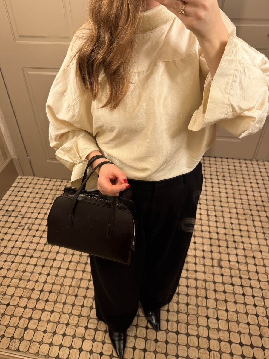 풍성한 퍼프 실루엣이 돋보이는 형태의 블라우스도 봄에 입기 딱 좋죠. 언뜻 보면 화이트 셔츠 같지만 소매 쪽에 은근한 벌룬 포인트가 있는 블라우스는 시크하면서 사랑스러운 느낌까지 더한답니다. 여기에 블랙 카프리 팬츠를 매치하면 클래식한 룩을 완성할 수 있어요.
