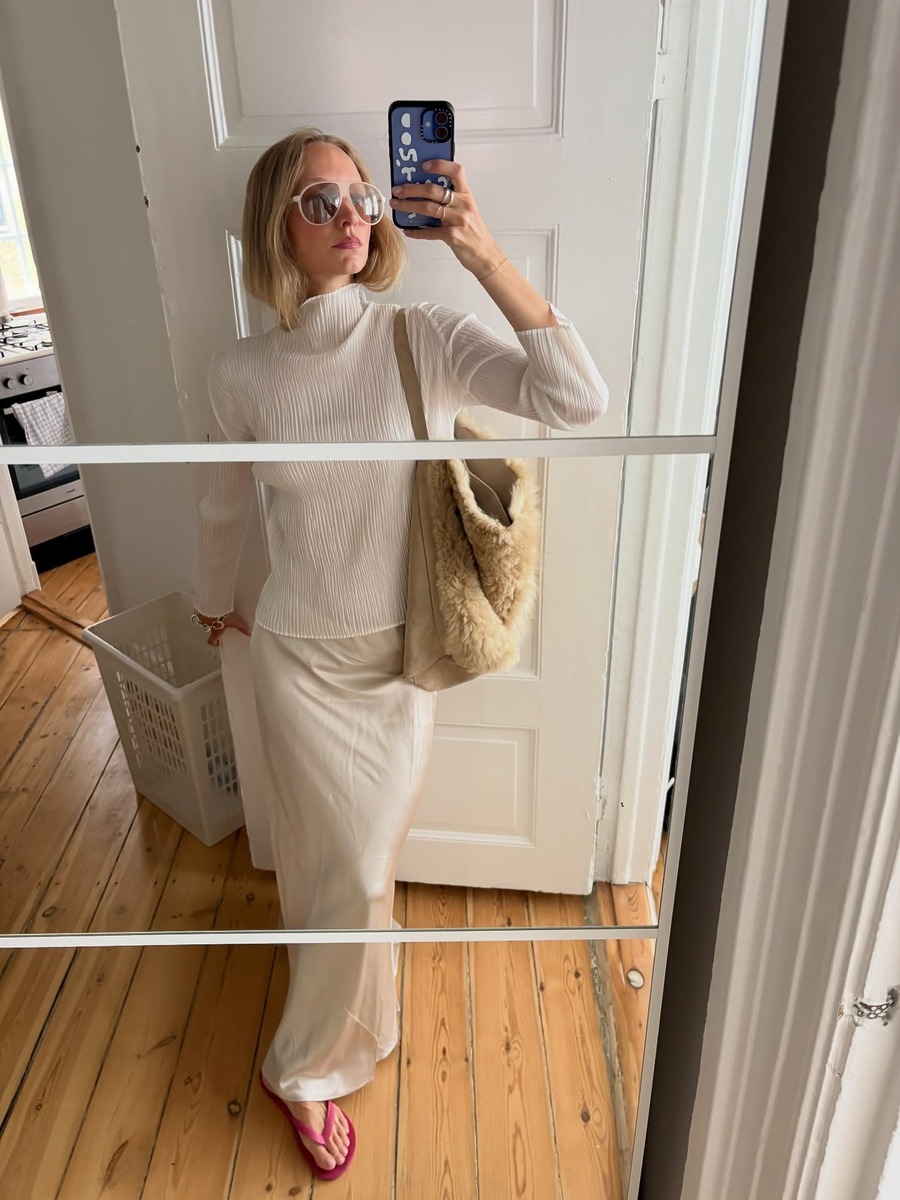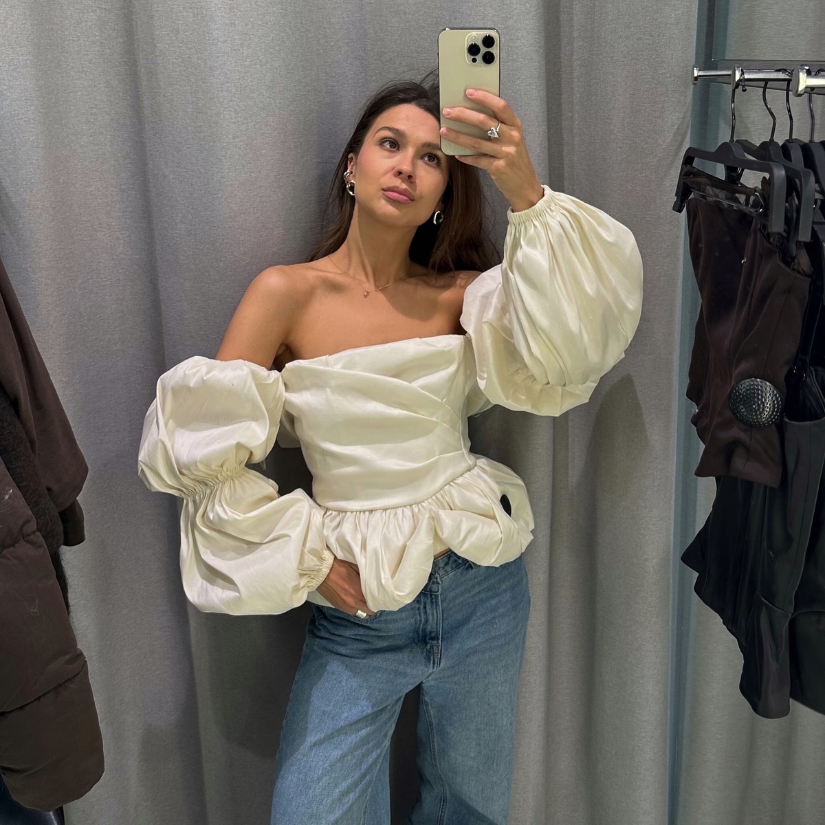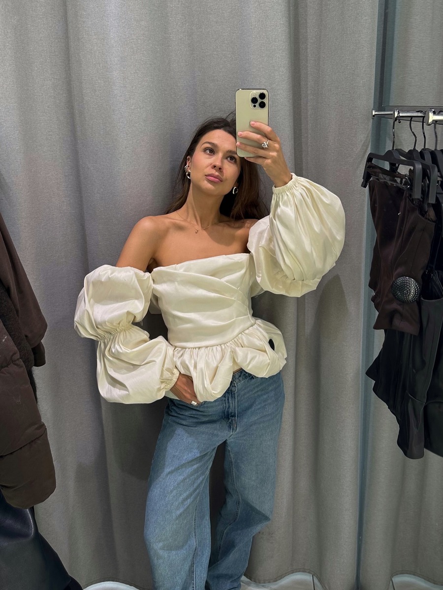 화이트 벌룬 블라우스에 데님 조합도 두말하면 입 아플 정도로 잘 어울린다는 사실! 어깨와 소매 부분의 벌룬 실루엣은 조금 과해도 괜찮아요. 와이드 팬츠가 그 매력을 한층 더 돋보이게 하거든요.