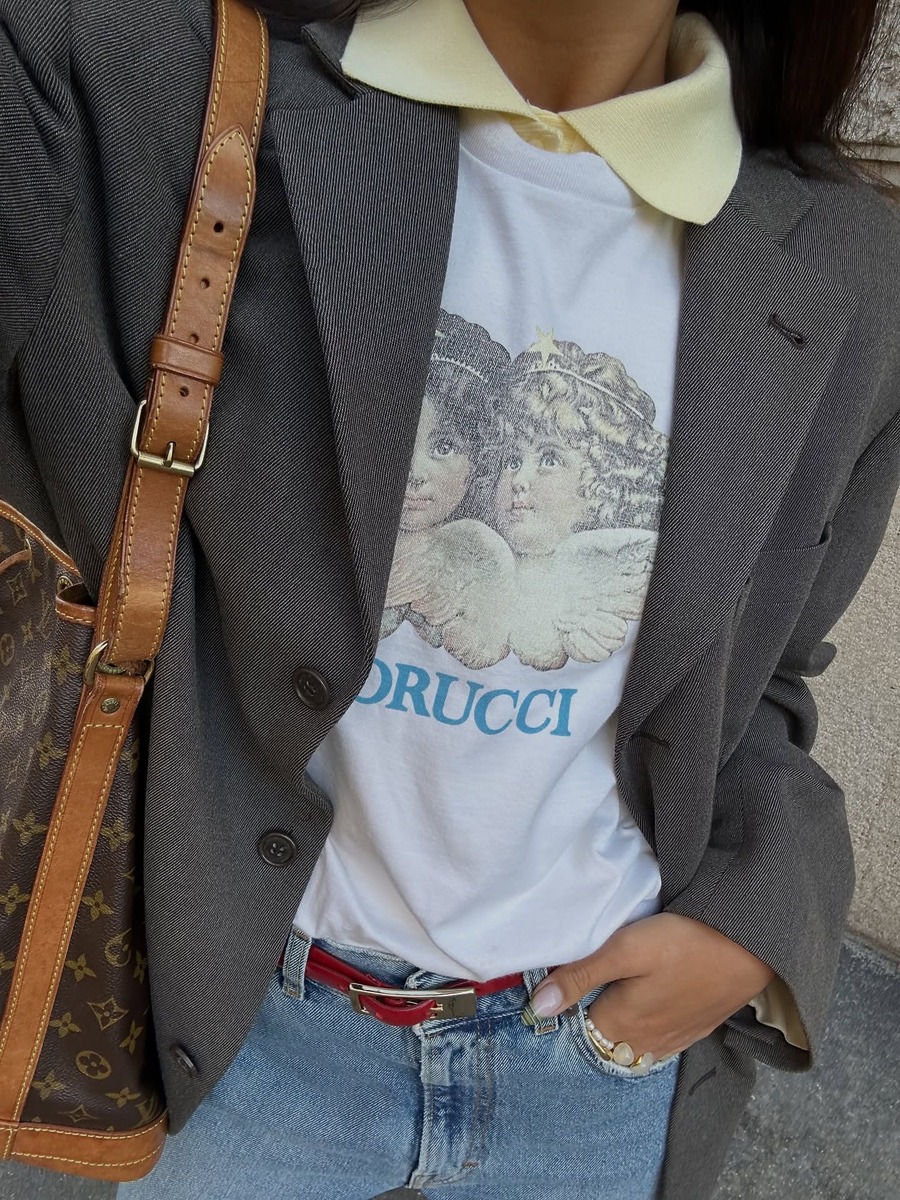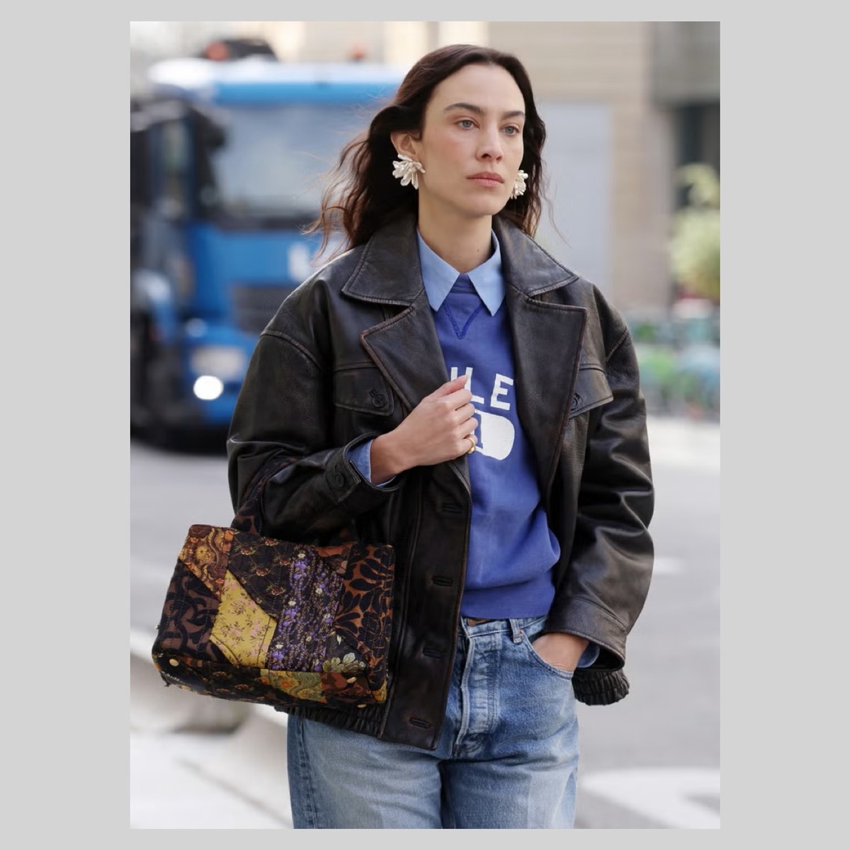 트렌드에 민감한 셀럽들의 데일리룩에는 이미 아메리칸 클래식 무드가 스며든 것처럼 보입니다. 일상에서 아메리칸 클래식 룩을 연출하는 가장 쉬운 방법은 단정한 셔츠에 캐주얼한 스웨트 셔츠를 레이어드하는 것! 알렉사 청은 파스텔 블루 셔츠에 짙은 코발트 블루 스웨트 셔츠를 레이어드하고 가죽 재킷으로 마무리해 편안하면서도 멋스러운 환절기 룩을 완성했습니다. 볼드한 귀걸이와 패치워크 백처럼 화려한 액세서리로 밋밋하지 않게 포인트를 더하는 것도 잊지 않았네요.