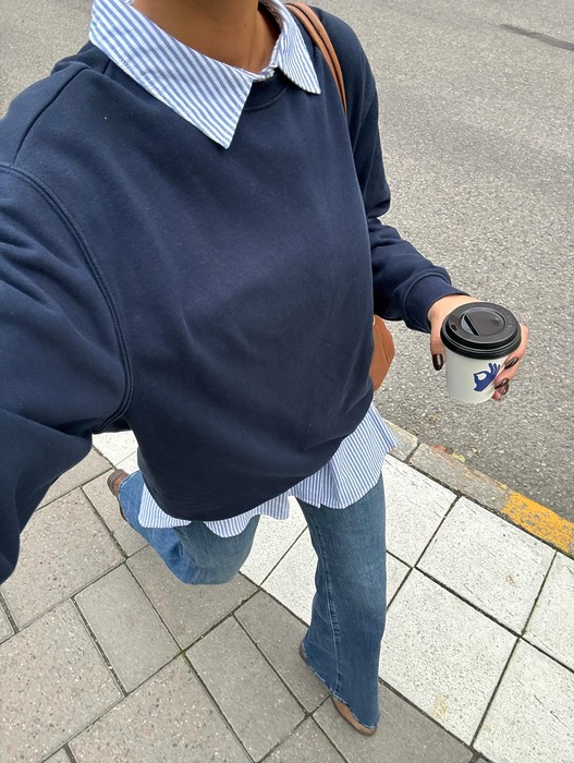 이너로 입는 셔츠 선택도 매우 중요합니다. 셔츠는 보조 역할을 담당하는 만큼 너무 강한 컬러보다는 파스텔 톤의 셔츠를 고르는 것이 현명하죠. 차분한 컬러의 스웨트 셔츠를 선택했다면, 잔잔한 스트라이프가 들어간 셔츠를 겹쳐 입어 과하지 않은 리듬감을 더해 보세요.