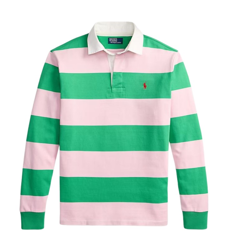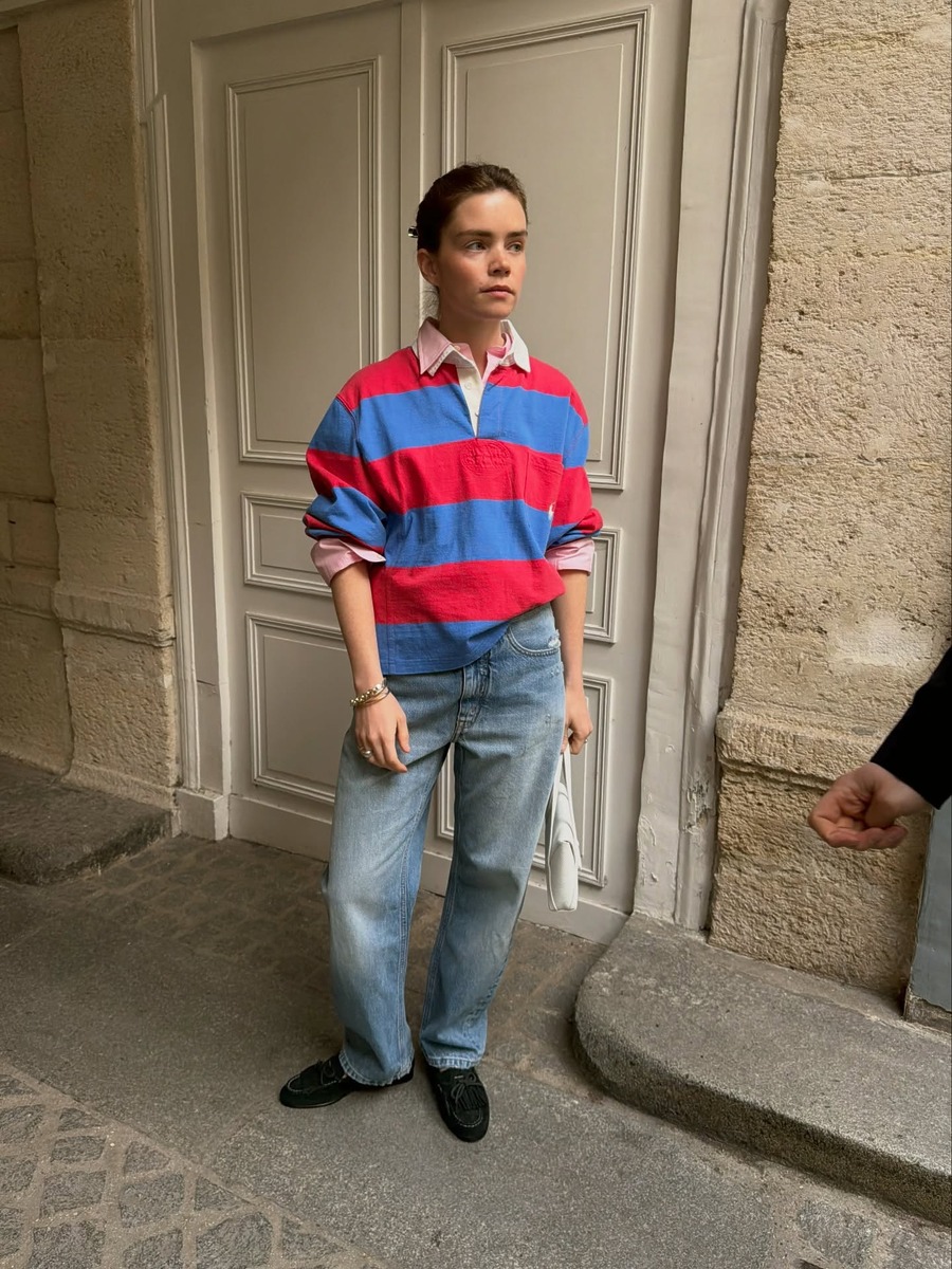 평범한 스웨트 셔츠 대신 럭비 셔츠를 활용해도 멋스럽습니다. 비비드한 컬러의 스트라이프가 들어간 디자인이라면 더욱 효과적이고요. 레드와 블루 스트라이프 럭비 셔츠 아래 연한 핑크 셔츠를 레이어드하는 것만으로도 룩에 깊이감이 살아납니다. 셔츠 칼라를 밖으로 빼고 커프스가 보이도록 소매를 걷어 올리는 등 디테일도 놓치지 마세요!
