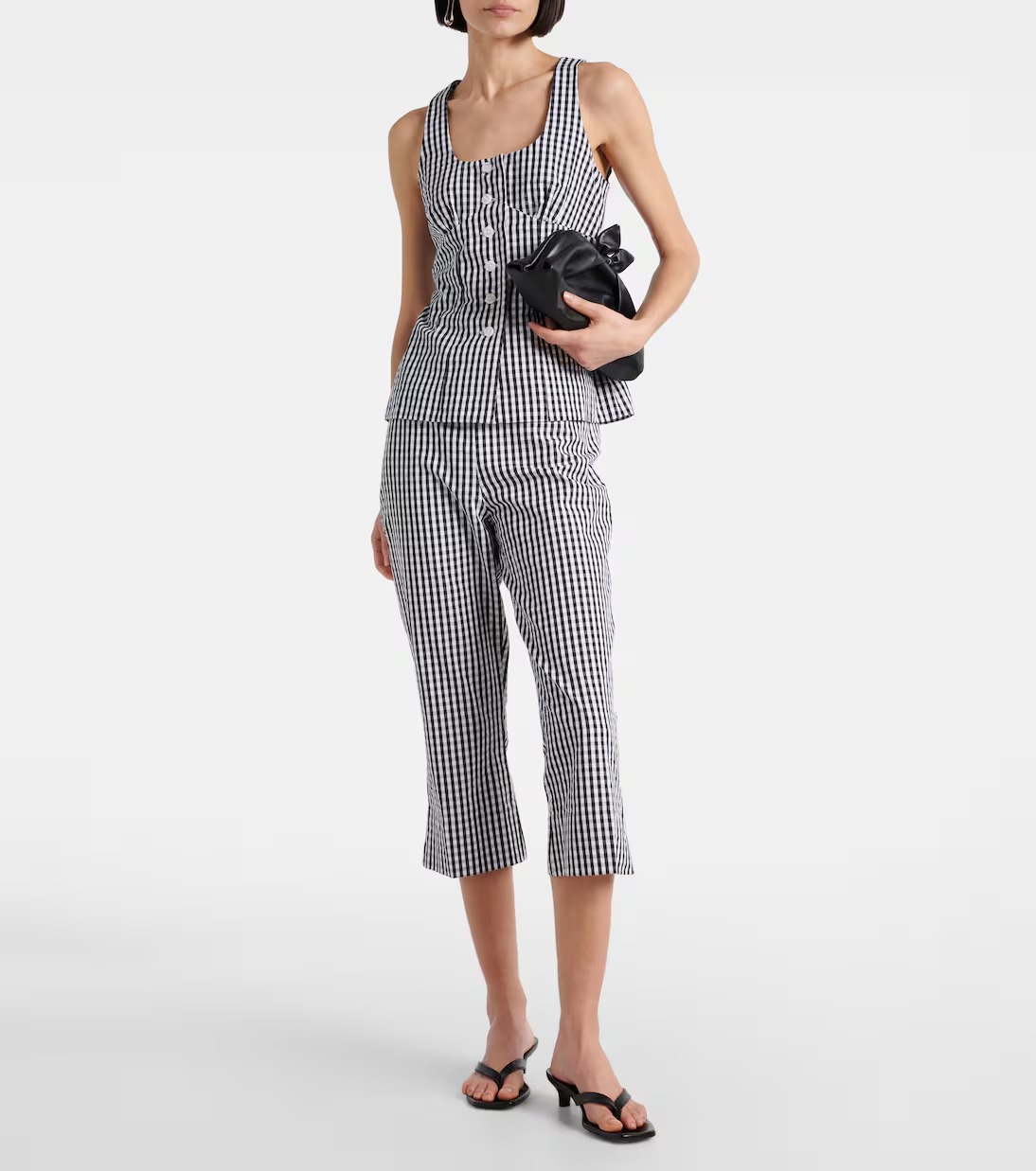 이렇게 매력적인 카프리 팬츠. 하지만 7~8부라는 기장 때문에 자칫하면 다리가 짧아 보일 수도 있습니다. 때문에 카프리 팬츠를 입을 때에는 상&하의 컬러를 통일해서 입으면 이런 걱정을 조금 덜 수 있습니다. 신발 선택에도 주의가 필요한데요, 발등을 가리는 것보다는 드러내는 디자인이 좋으며, 만일 발등을 가릴 경우 피부 톤과 유사한 스킨 톤의 신발이 좋습니다. 또, 신발 코도 둥근 것보다는 날렵한 스틸레토를 선택하면 비율을 좀 더 좋아 보이게 연출할 수 있어요.