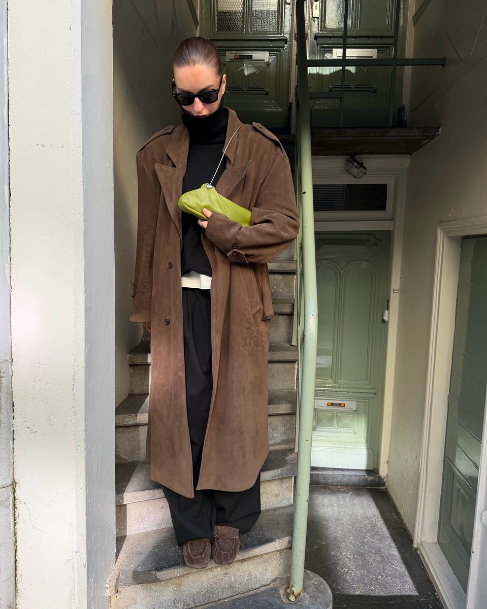 레더가 부담스럽게 느껴진다면 스웨이드부터 시작해보세요. 부드럽고 포근한 질감의 스웨이드는 봄과 특히 잘 어울리는 소재입니다. 브라운 스웨이드 아우터 하나로 고급스러우면서도 화사한 봄 데일리룩을 완성할 수 있거든요. 올블랙 베이스에 브라운 스웨이드 코트를 더하고, 그린 클러치로 포인트를 주면 전체적으로 싱그러운 봄 기운이 살아납니다. 레더이지만 레더 같지 않은 부드러움과 유연함이 스웨이드의 매력 포인트죠.
