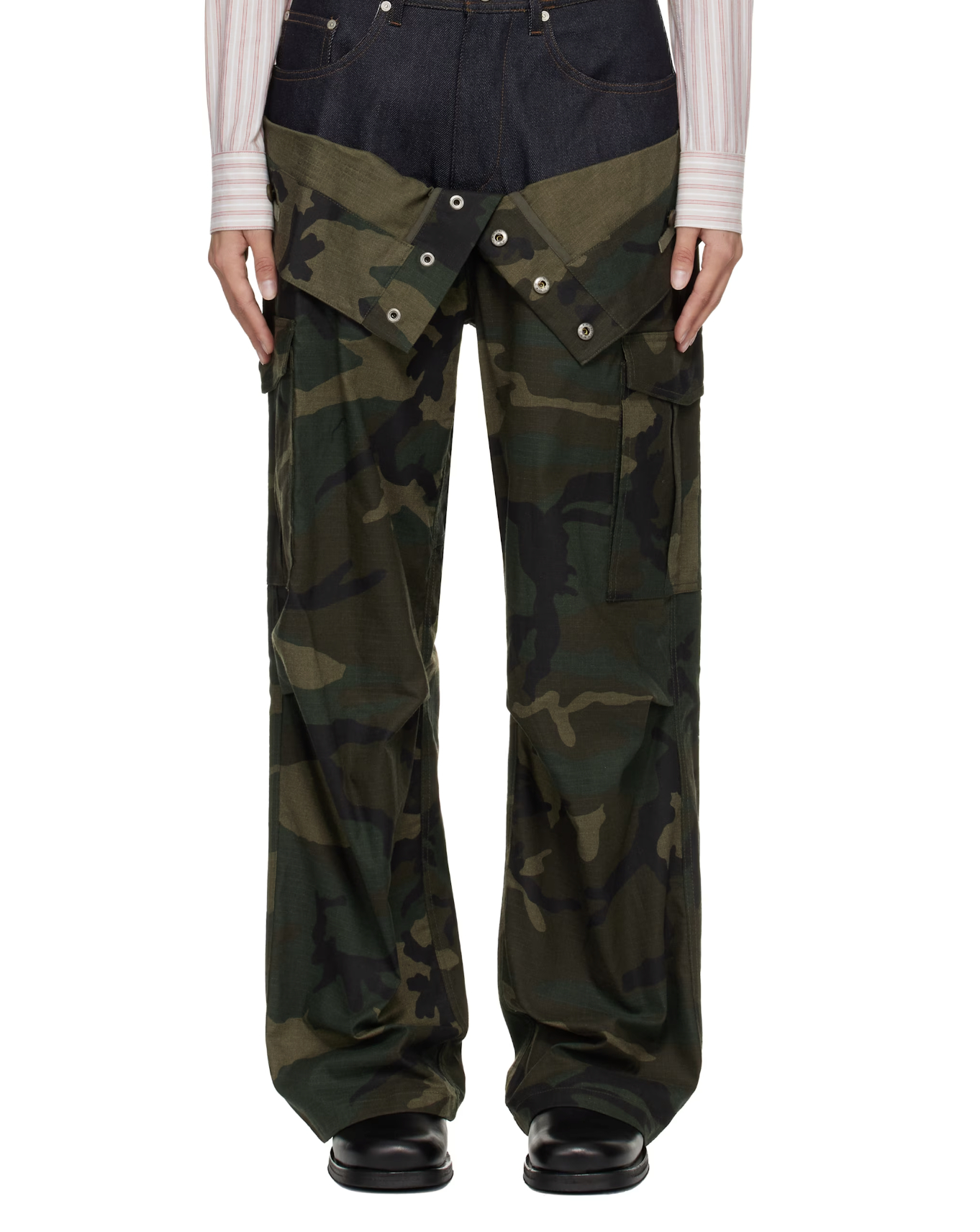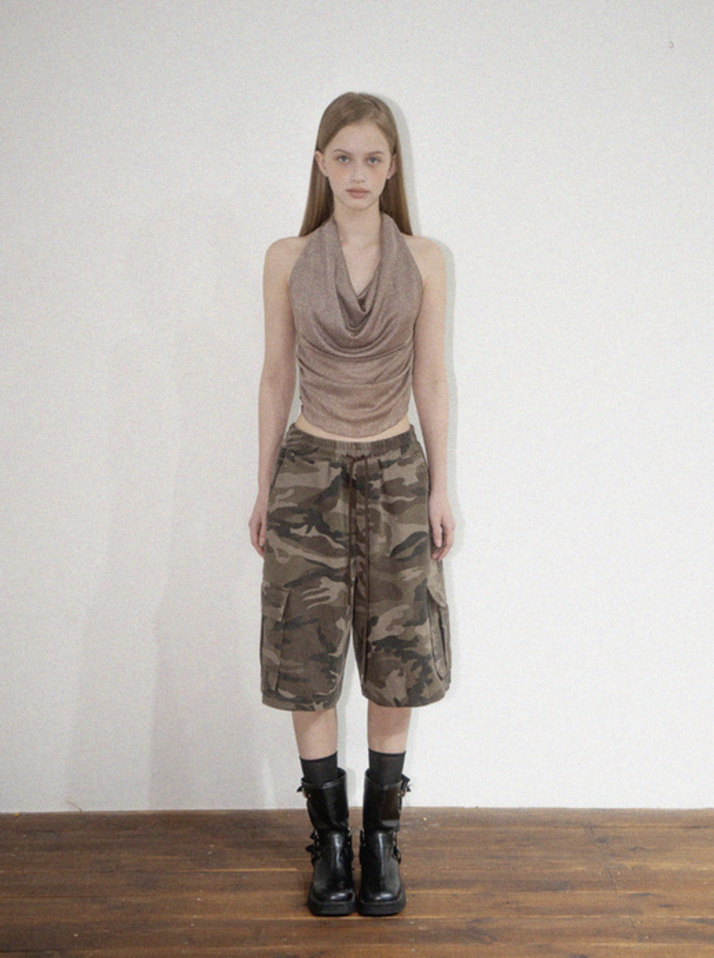 카모플라주 패턴을 스타일링할 때 무엇보다 중요한 것은 균형입니다. 패턴 자체의 존재감이 강한 만큼 과하지 않은 아이템을 함께 매치해 밸런스를 맞춰야 하죠. 음악만큼이나 트렌디한 스트릿 스타일로 패션계의 사랑을 한 몸에 받고 있는 페기구는 카모플라주 팬츠에 홀터넥 톱을 매치해 터프함과 섹시함이 공존하는 룩을 완성했습니다. 개성 강한 카모 패턴에 관능적인 톱을 매치해 부드럽게 풀어낸 센스가 돋보입니다.