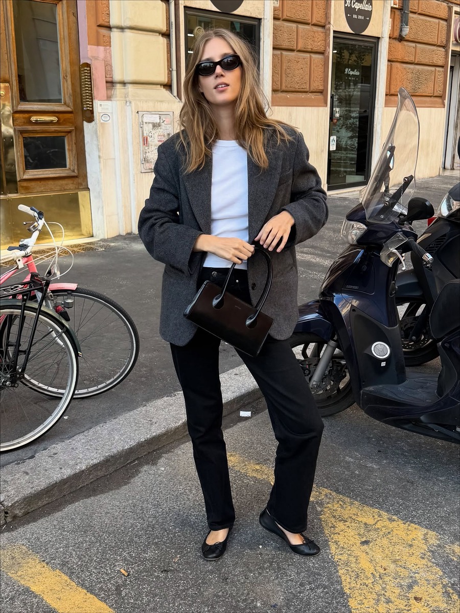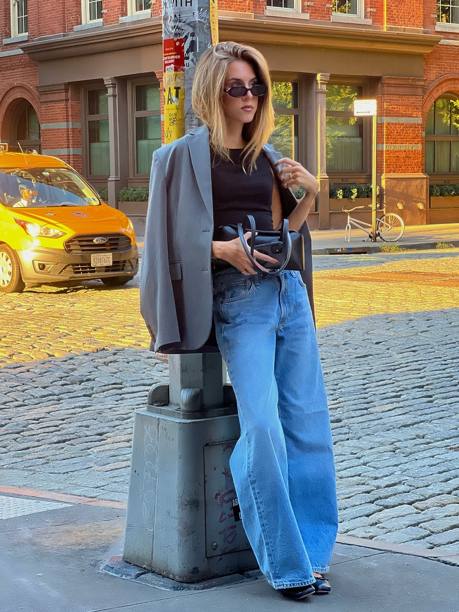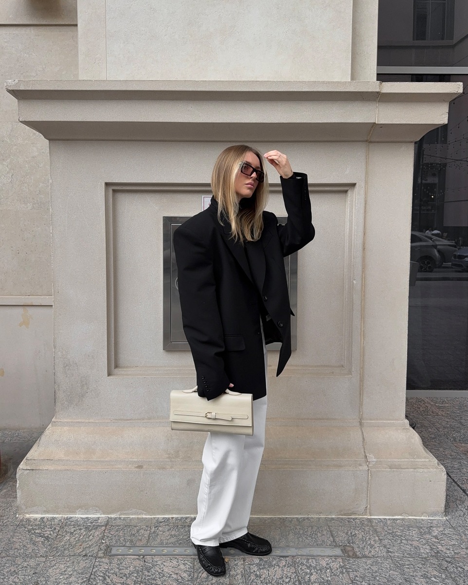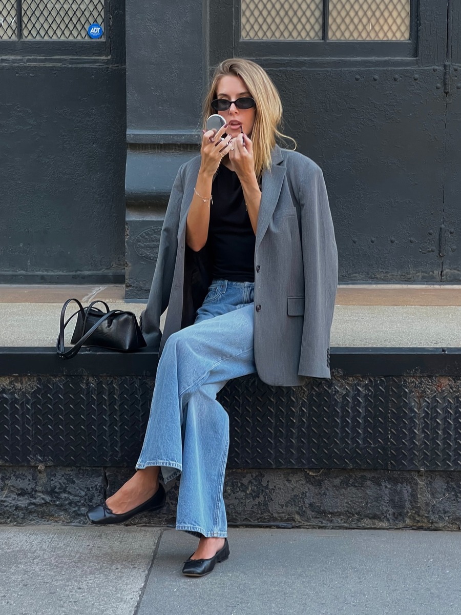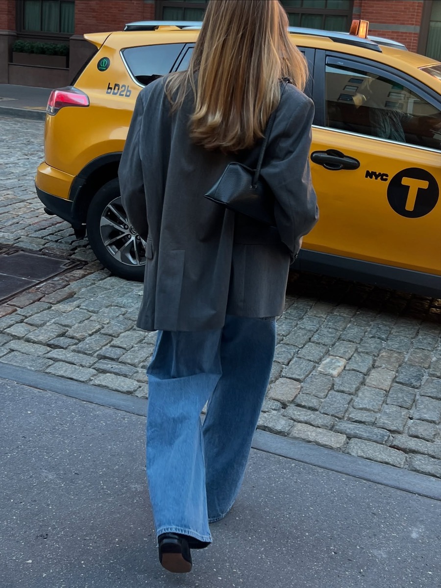 완연한 봄에는 좀 더 화이트가 섞인 밝은 그레이 컬러도 추천해요. 데님과 입었을 때 최적의 궁합을 자랑하죠. 와이드 데님 팬츠, 화이트 톱에 오버사이즈 블레이저를 걸치고 플랫슈즈로 마무리한 산뜻한 스타일링을 눈여겨보세요.