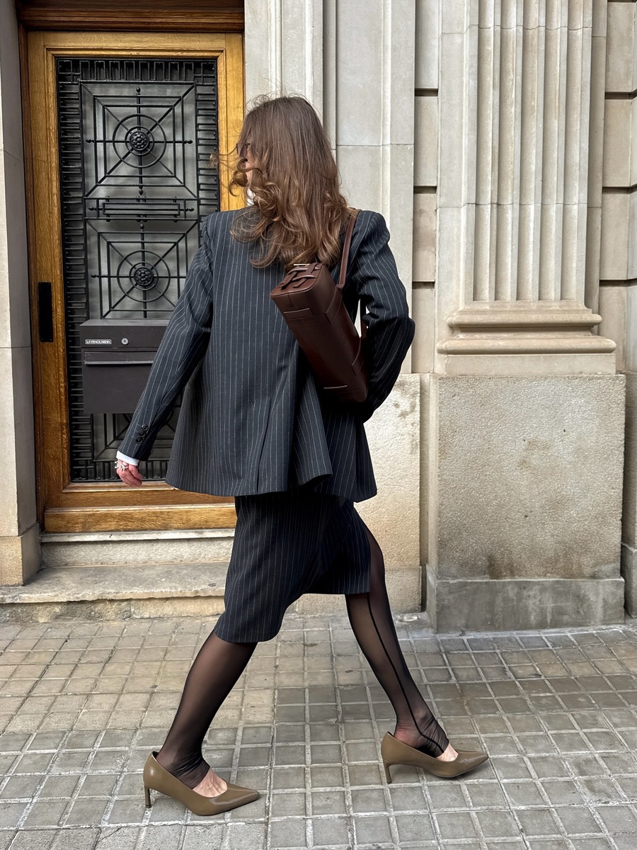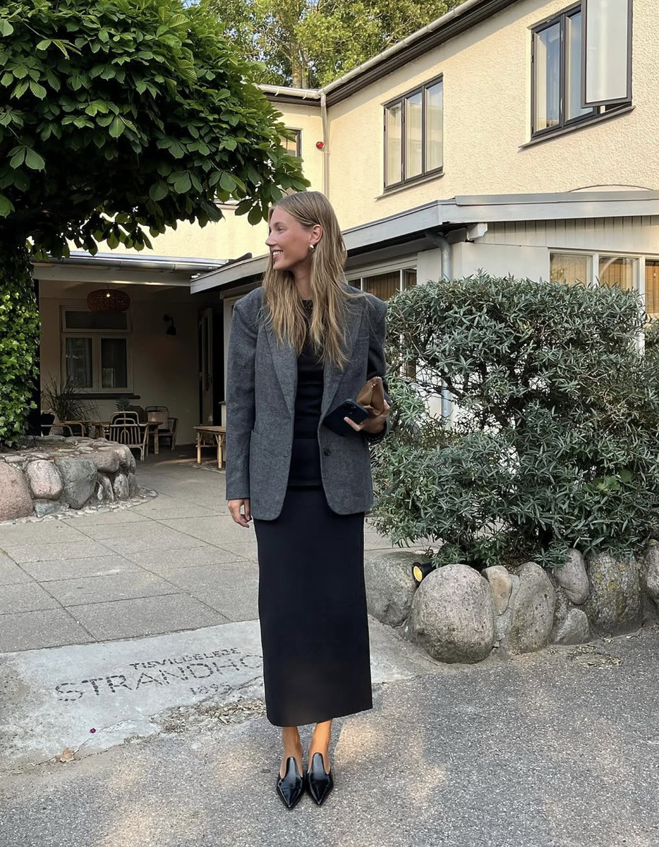 미니멀한 스타일을 즐기는 세실리아 무스가드는 울 블레이저를 데일리룩에 많이 활용하는 걸로 유명하답니다. 블랙 롱 펜슬스커트에 블랙 니트 톱, 그리고 그레이 컬러 블레이저를 걸치면 하객룩으로도 손색이 없죠. 단정한 멋을 더해주는 로퍼와 미니 클러치 백으로 스타일을 완성해 보세요.