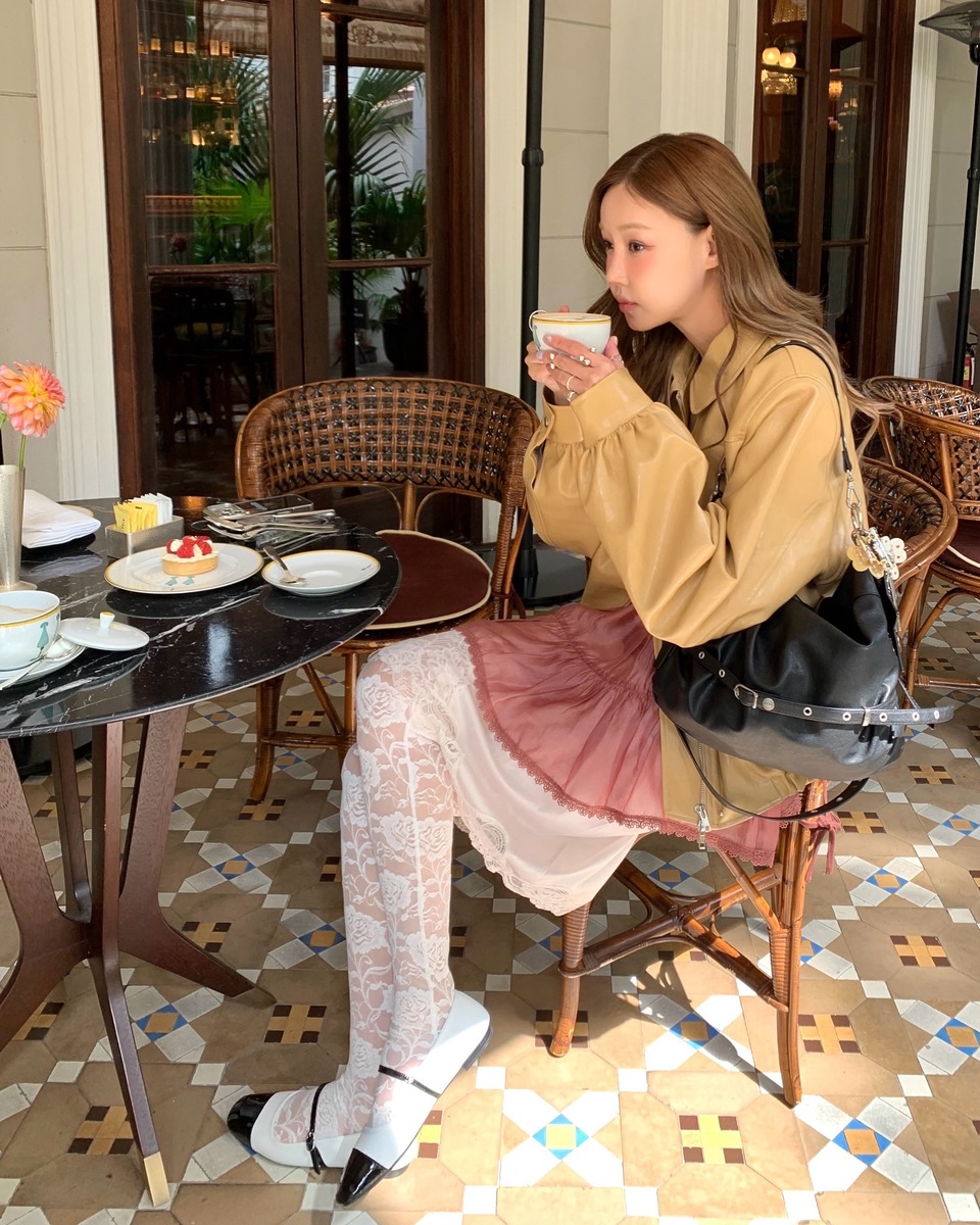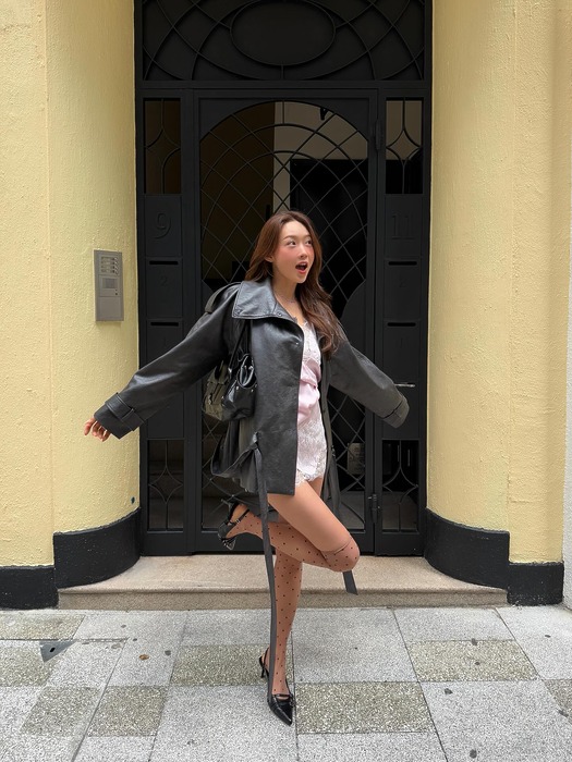 아마 이번 봄 가장 많이 보일 스타일이 아닐까 싶어요. 레이스가 트리밍 된 슬립 드레스와 레더 아우터 조합! 여기에 니삭스 또는 스타킹 그리고 플랫 슈즈를 더해 사랑스러움을 더해주는 거죠. 올시즌 가장 트렌드 아이템으로 떠오른 가죽 점퍼와 란제리 트렌드를 한 번에 누릴 수 있는 스타일링!