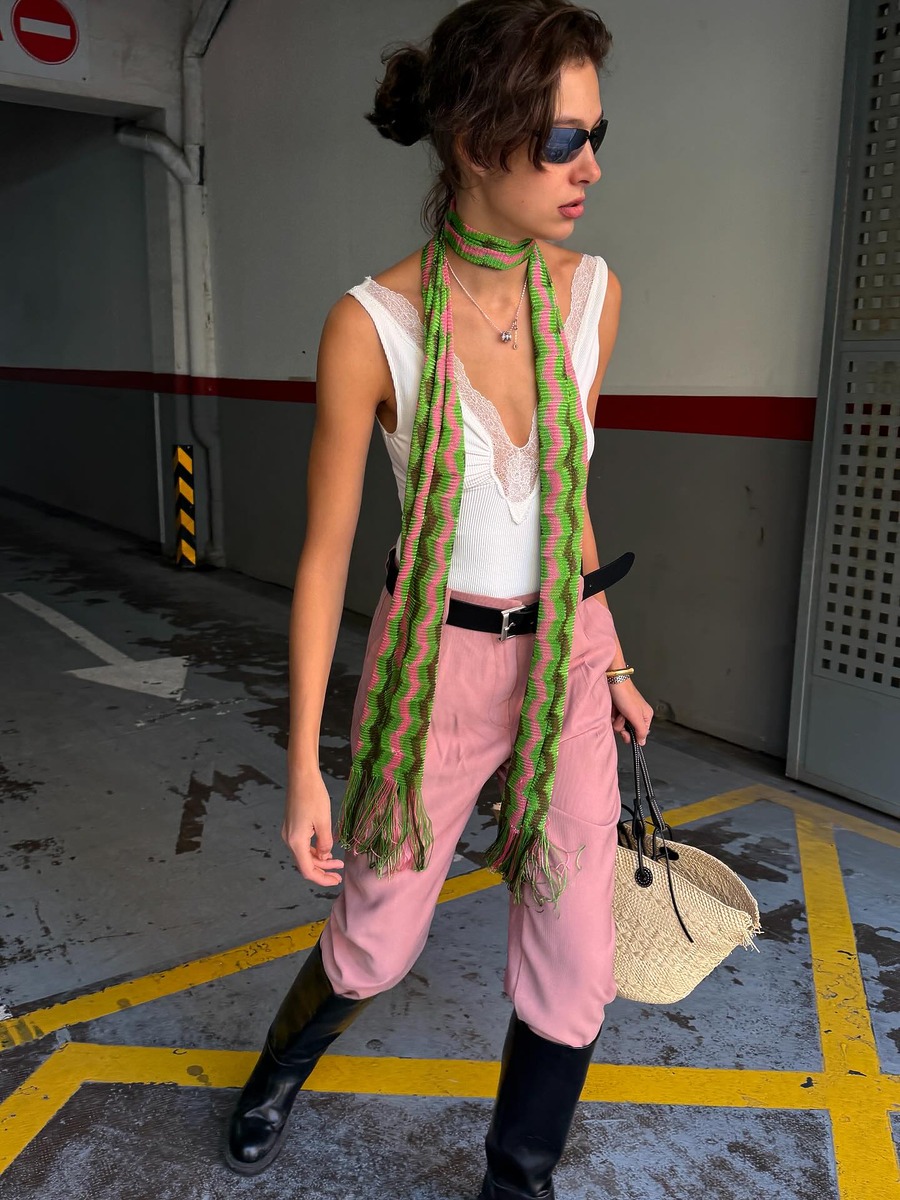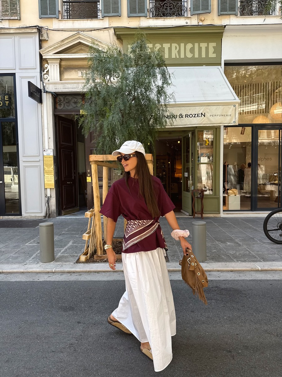롱스커트에 박시한 무지 티셔츠, 볼캡으로 연출한 스타일에도 허리에 스카프 하나만 더하면 훨씬 스타일리시해 보이죠. 심심하지 않도록 약간의 패턴이 들어간 스카프를 고르는 것이 핵심입니다.