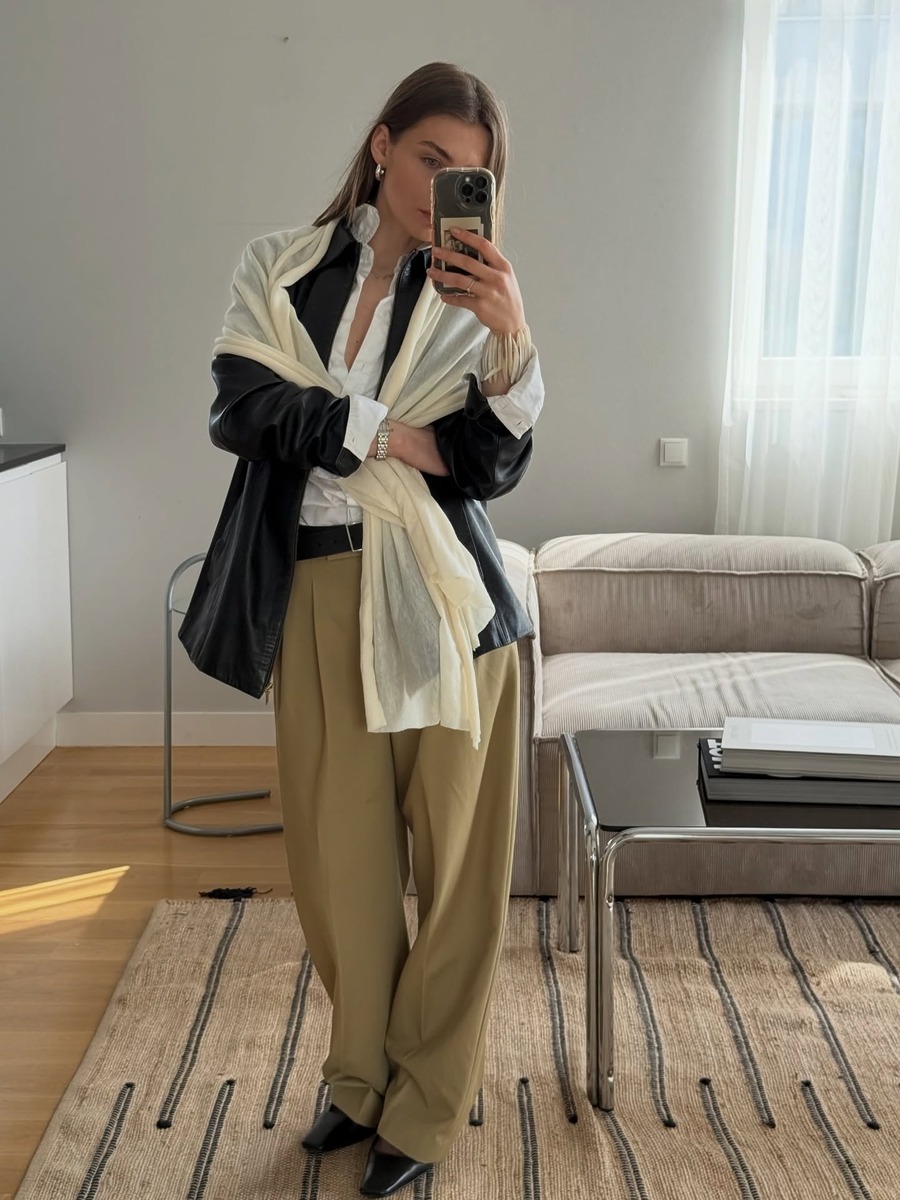 스카프를 모던하게 연출하고 싶다면 블랙이나 화이트처럼 무채색 계열로 통일해 보세요. 올 화이트 룩에 긴 블랙 머플러를 허리에 벨트처럼 둘러 마무리하면 포인트가 되면서 세련된 느낌을 더하죠. 기온이 조금 더 내려가는 저녁엔 어깨에 숄처럼 걸칠 수도 있으니 활용도도 만점입니다.